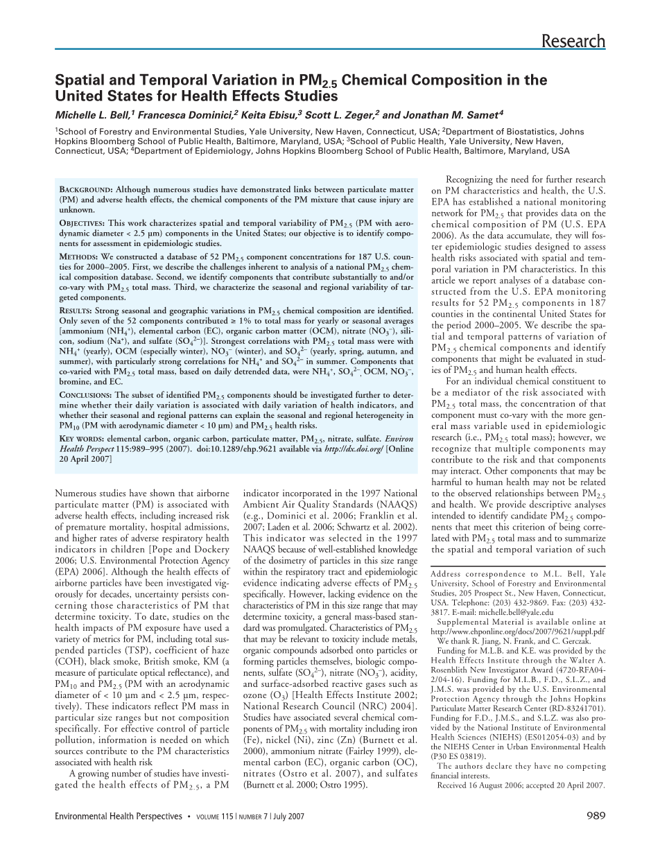 越来越多的研究调查了PM2.5 的健康影响PM2.5 是1997年“国家环境空气质量标准”(NAAQS)纳入的 PM指标(例如,Dominici等2006; Franklin et al。2007; Laden et al。2006 ; Schwartz等人,2002)。该指标在1997年NAAQS中被选中,因为在呼吸道内的这一尺寸范围内的粒子剂量测定知识和流行病学证据具体表明 PM2.5对健康的不良反应。然而,缺乏可以决定毒性的这种尺寸范围内的PM特征的证据,一般的基于质量的标准被颁布了。可能与毒性有关的PM 的特征包括金属,吸附在颗粒上的有机化合物或自身形成颗粒,生物成分,硫酸盐(SO42-),硝酸盐(NO3-),酸度,和表面吸附的反应性气体如臭氧(O)[Health Effects Institute 2002; 3国家研究理事会(NRC)2004]。研究已将PM2.5的几个化学成分与死亡率联系在一起(包括铁(Fe),镍(Ni)),锌(Zn)(Burnett等2000),硝酸铵(Fairley 1999),碳(EC) ),有机碳(OC),硝酸盐(Ostro et al。2007)和硫酸盐(Burnett等人2000; Ostro1995)认识到有必要对 PM特性和健康进行进一步研究,美国环保署已经建立了PM2.5的国家监测网络,该网络提供PM的化学成分数据(美国EPA 2006)。 随着数据的积累,他们将进行流行病学研究,旨在评估PM特征的空间和时间变化相关的健康风险。 在本文中,我们报告了美国环保局监测结果对2000-2005年美国187个郡的52个 PM组件的数据库的分析。 我们描述了PM 化学成分的变化的时空模式,并确定PM2.5研究中可能进行评估的成分和对人体健康影响。