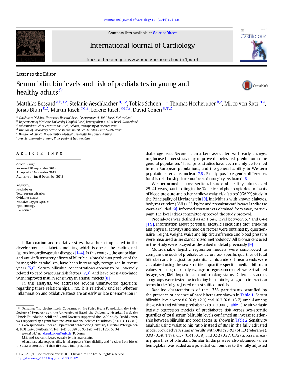 Letter to the Editor Serum bilirubin levels and risk of prediabetes in young and healthy adults Matthias Bossard a,b,1,2, Stefanie Aeschbacher b,1,2, Tobias Schoen b,2, Thomas Hochgruber b,2, Mirco von Rotz b,2,Jonas Blum b,2, Martin Risch c,d,2, Lorenz Risch c,e,f,2, David Conen b, 2 a Cardiology Division, University Hospital Basel, Petersgraben 4, 4031 Basel, Switzerland b Department of Medicine, University Hospital Basel, Petersgraben 4, 4031 Basel, Switzerland Labormedizinisches Zentrum Dr. Risch, Schaan, Principality of Liechtensteind Division of Laboratory Medicine, Kantonsspital Graubuuml;nden, Chur, Switzerlande Division of Clinical Biochemistry, Medical University, Innsbruck, Austriaf Private University, Triesen, Principality of Liechtenstein article info Article history:Received 10 September 2013 Accepted 30 November 2013 Available online 6 December 2013.