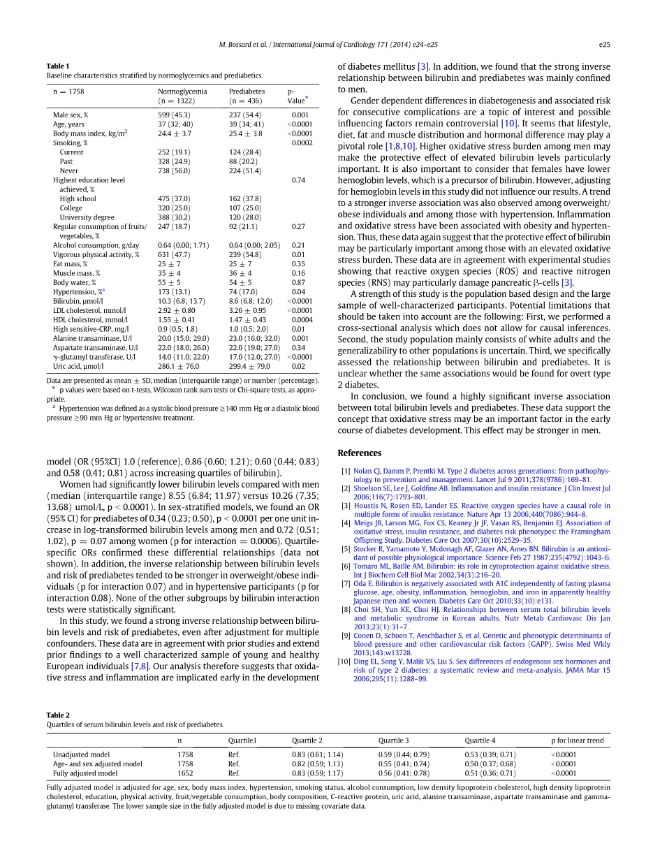 Keywords:Prediabetes Total serum bilirubin Oxidative stress Reactive oxygen species Epidemiology Biomarker Inflammation and oxidative stress have been implicated in the development of diabetes mellitus, which is one of the leading risk factors for cardiovascular diseases [1–4]. In this context, the antioxidant and anti-inflammatory effects of bilirubin, a breakdown product of the hemoglobin catabolism, have been increasingly recognized in recent years [5,6]. Serum bilirubin concentrations appear to be inversely related tocardiovascular risk factors [7,8], and have been associated with improved insulin sensitivity in animal models [8].In this analysis, we addressed several unanswered questions regarding these relationships. First, it is relatively unclear whether inflammation and oxidative stress are an early or late phenomenon in diabetogenesis. Second, biomarkers associated with early changes in glucose homeostasis may improve diabetes risk prediction in the general population. Third, prior studies have been mainly performed in non-European populations, and the generalizability to Western populations remains unclear [7,8]. Finally, possible gender differences for this relationship have not been thoroughly evaluated [8].