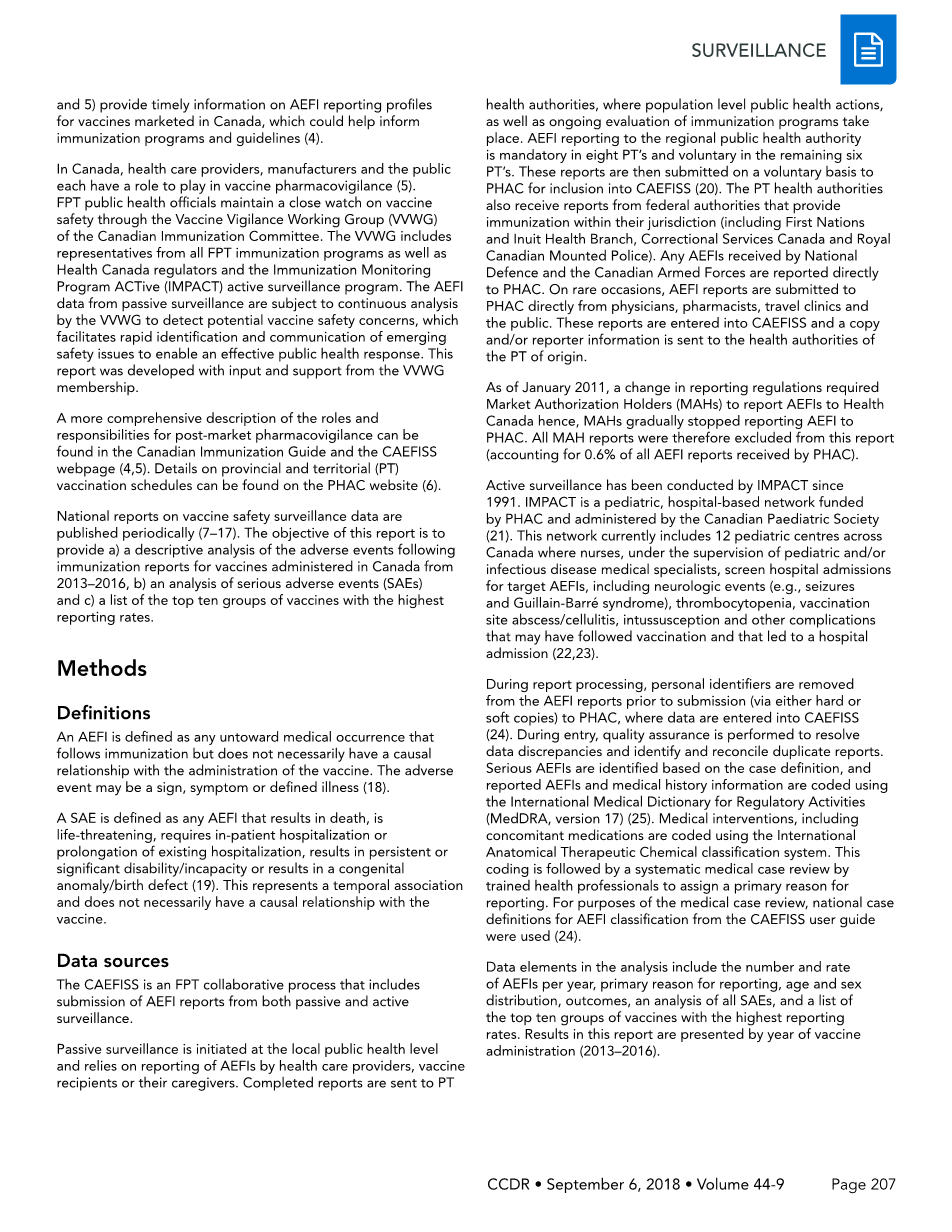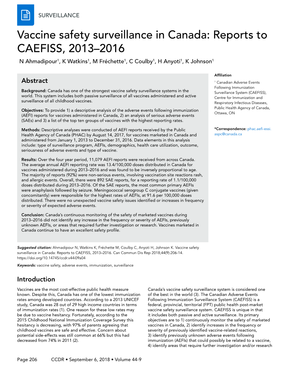 CAEFISS是一个联邦,省,地区的协作过程,其中包括来自被动和主动监视的AEFI报告的提交。