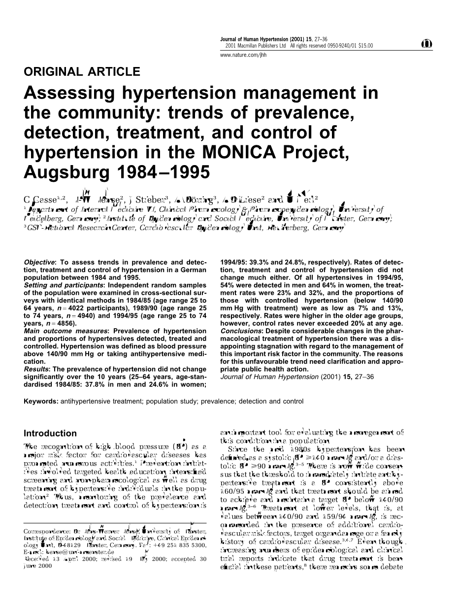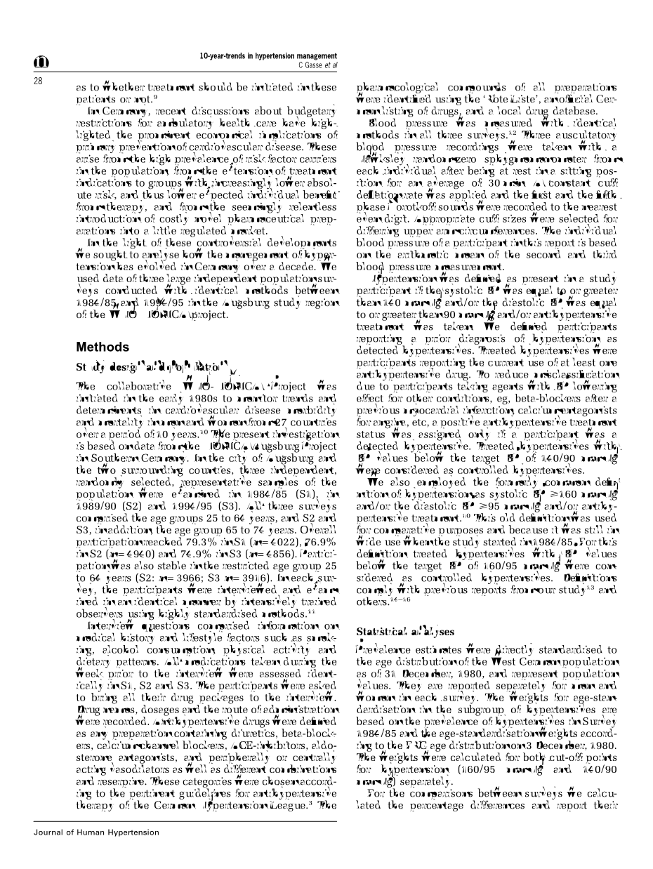 目的:评估德国在1984-1995年间高血压患病率的总体趋势、高血压治疗和控制效果。研究方法与对象:在1984/85(选择的研究对象年龄范围在24-60岁之间,样本量n=4022)、1989/90(选择的研究对象年龄范围在25-74岁之间,样本量n=4940)、1994/95(选择的研究对象年龄范围在25-70岁,样本量n=4856)年间,采用独立抽样方法进行横断面调查。主要措施:对高血压患者的血压情况进行检测分析,血压在140/90 mm/Hg以上进行降压药物治疗,观察高血压患者的血压控制情况。结果:在这十年间高血压控制效果不明显,患病率并无太大改变。且在治疗中发现男性和女性,高血压控制率分别是23%和32%,血压指数在140/90mm/Hg以下的患者组控制率分别低至7%和13%,年龄较大组的死亡率较高,高血压控制率在任何年龄段都低于20%。