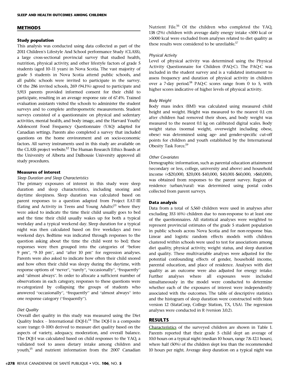 饮食质量、身体活动、体重与睡眠持续时间和睡眠质量有关吗?一项基于加拿大儿童的人群研究
