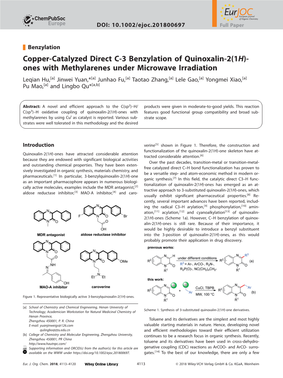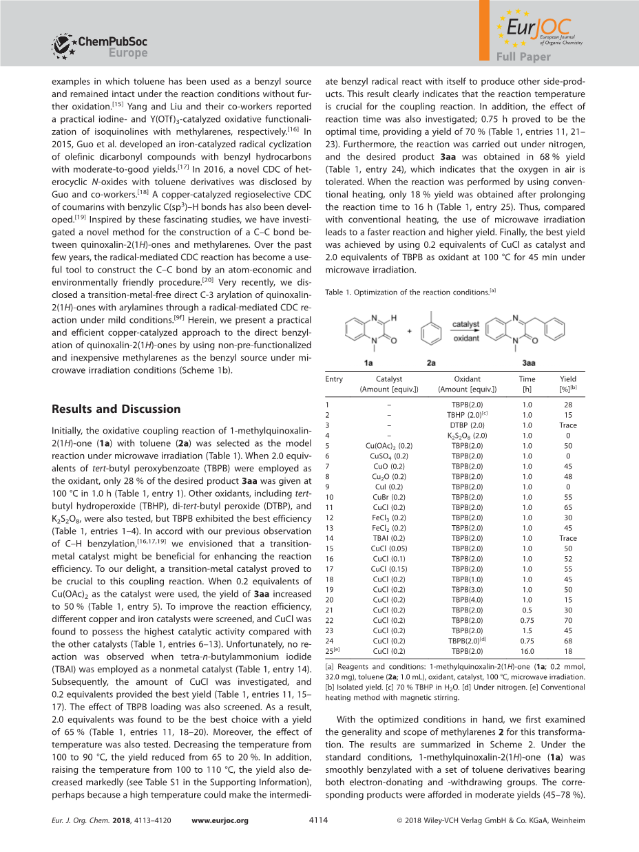 甲苯及其衍生物是最简单、含量最高的有价值的起始材料。因此,发展新的有效的关于有效利用它们的方法将一直是有机合成的研究重点。最近,甲苯及其衍生物作为ArCOO-和ArCO-替代物被用于交叉脱水基因组耦合反应。[14]据我们所知,很少有甲苯被用作苯甲基源并在反应条件下保持完整没有发生进一步氧化的例子。[15]杨、刘以及他们的同事们都分别报道过一种实用的关于甲烯基异喹诺啉类药物的碘和Y(OTf)3催化氧化功能化。[16]在2015年,郭发现带有苄基的烯烃二羰基化合物在铁催化下进行自由基环化反应时有着中等到良好的产量。[17]2016年,郭和他的同事们公开了一种新型CDC,它是含有甲苯衍生物的热环化氮氧化物。[18]在铜催化下,含苯基C(sp3)-H键的香豆素且具有区域选择性的CDC也有所发展。[19]受这些有趣的研究的启发,我们研究了一种新的方法来在2(1H)-喹喔啉酮和甲基甲烯键之间构建C-C键。在过去的几年来,自由基介导的CDC反应已经成为一个有用的工具,它通过原子经济和环境环保的步骤来构建C-C键。[20]最近,我们在温和条件下通过自由基介导的CDC用芳香胺关闭了2(1H)-喹喔啉酮的非过渡金属直接芳基化。[9f]在这里,我们提出了一个实际的并高效的铜催化法进行2(1H)-喹喔啉酮的直接苯基化,通过在微波照射条件下使用未进行预功能化的廉价甲基甲烯作为苄基源。