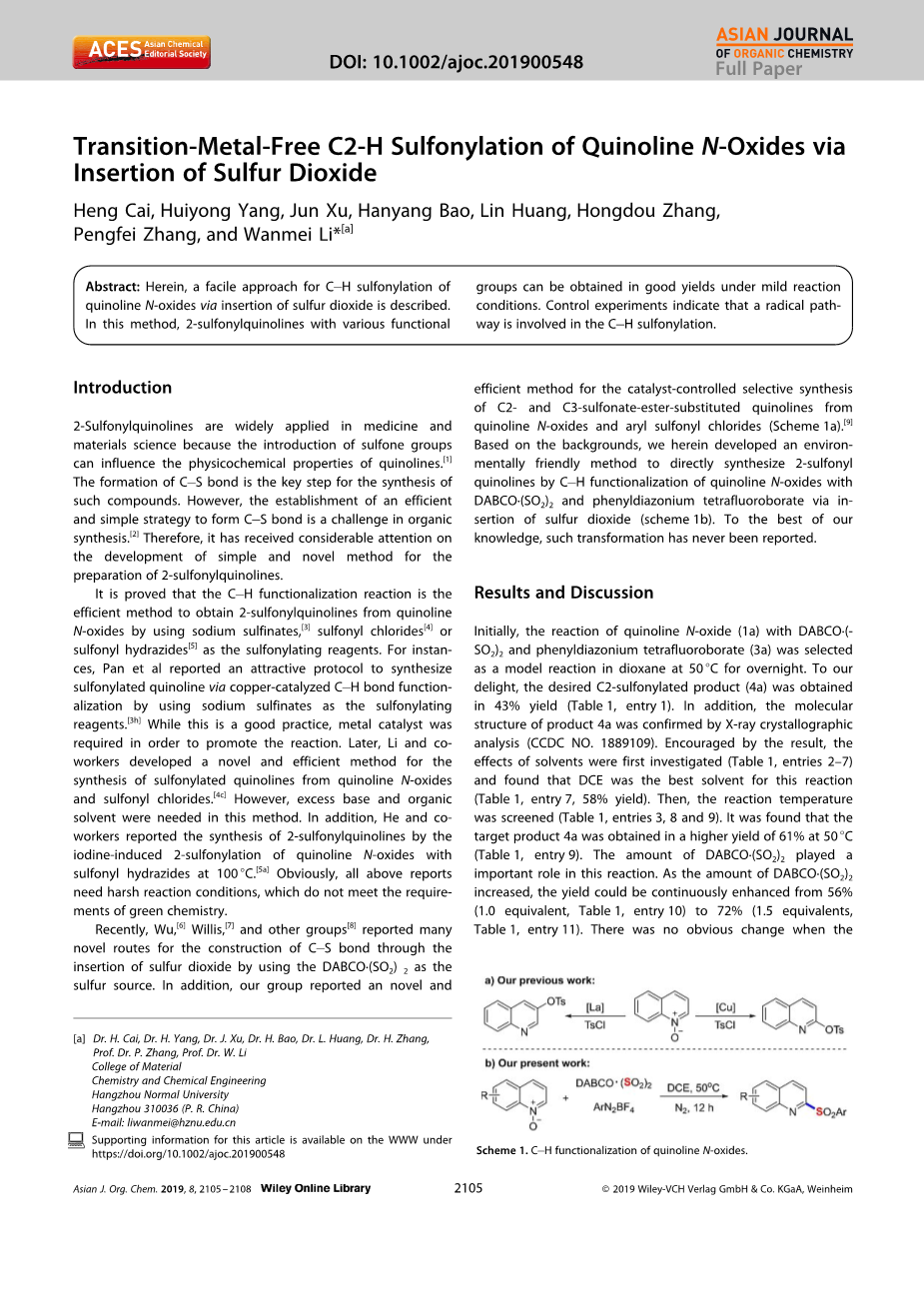 关键词:无过渡金属; 喹啉N-氧化物; C-H官能团化; DABCObull;(SO2)2