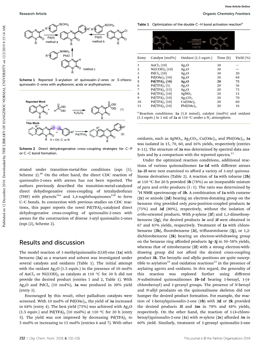 方案1 报道了喹喔啉-2-酮或3-氯喹喔啉-2-酮与芳基硼酸或芳基肼的3-芳基化。