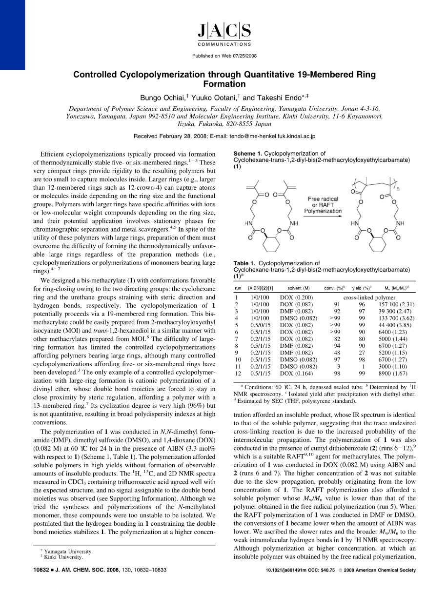 我们设计了一种对环闭合具有良好构象的双甲基丙烯酸酯(1),这种良好的构象要归功于化合物中两个具有指向性的官能团:分别是六元环和由于立体效应和氢键作用而相互拉紧的聚氨酯组。1的环化聚合可能通过一个19元环的形成来实现。这种双甲基丙烯酸甲酯可以很容易地由2-甲基丙烯酰氧乙酯,异氰酸酯(MOI)和反式1,2-己二醇来制备,这种方式就类似于用MOI制备其他丙烯酸甲酯8。尽管许多可形成五、六元环的受控环聚合反应已经被开发出来,但形成大环的困难仍然限制了许多可提供大环聚合物的受控环聚合反应的进行3。目前为止,成功合成大环的受控环聚合的唯一例子是一种二乙烯醚的阳离子聚合,这种二乙烯醚的双键部分由于立体效应被迫靠的很近。该反应可形成一种13元环聚合物7。反应的环化程度很高(96%),但却不是定量进行的,这就使得该反应会在高转化率下产生广泛的多分散性指数。