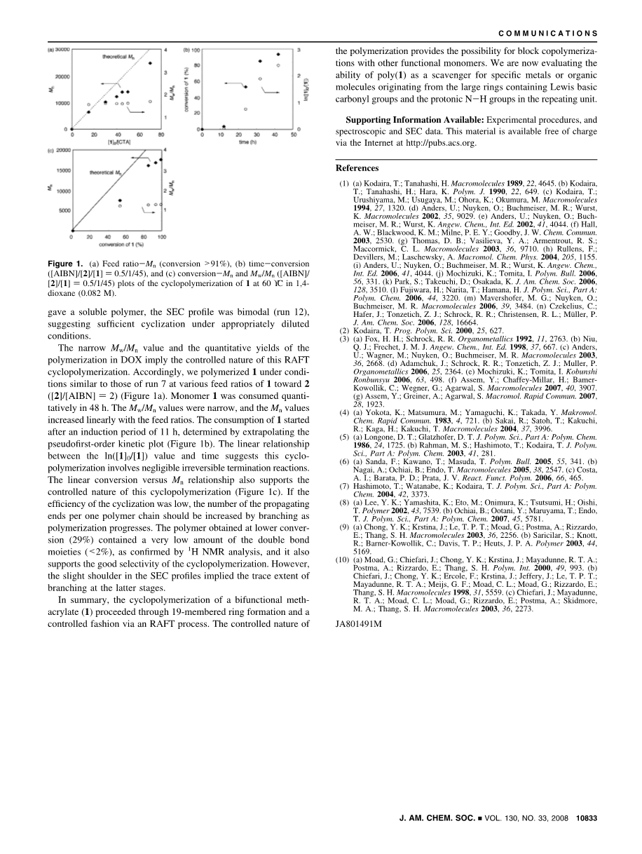 综上所述,双官能甲基丙烯酸甲酯(1)的环化聚合过程是通过19元环的形成和受控的RAFT聚合方式来进行的。聚合反应的受控性质,提供了与其他官能单体共聚的可能性。。我们现在正在评估聚(1)作为对特定金属或有机分子的清除剂能力,这些有机分子来源于在重复单元中含有路易斯羰基和质子N-H基团的大环分子。