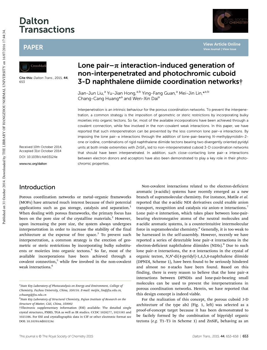 孤对 pi; 电子相互作用诱导的非穿插和光致变色的长方体三维萘二酰亚胺配位网络的生成