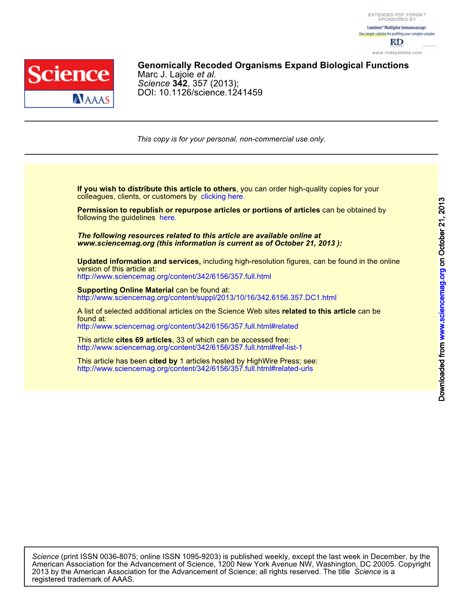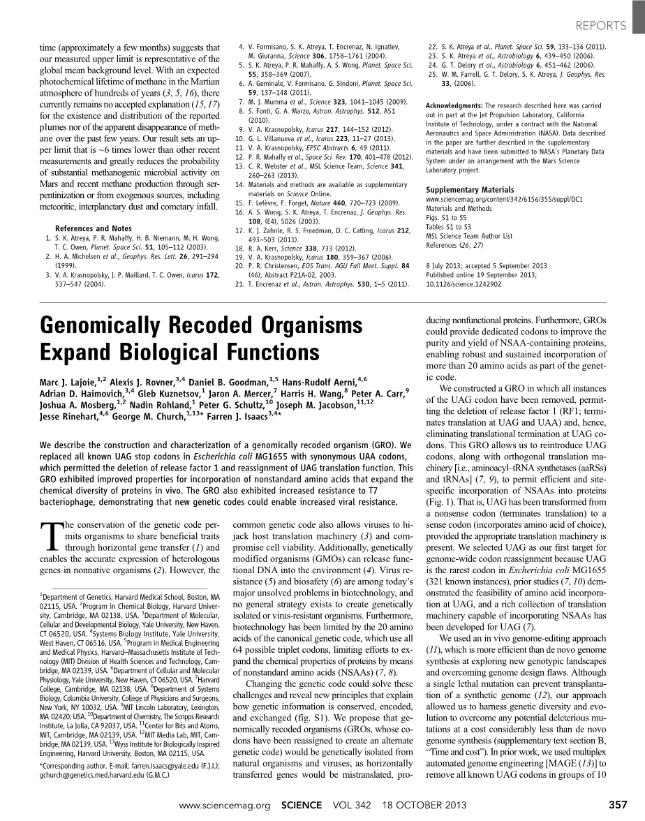 原文作者:Marc J. Lajoie, [1],[2]Alexis J. Rovner,[3],[4]Daniel B. Goodman,1,[5]Hans-Rudolf Aerni,4,[6]Adrian D. Haimovich,3,4Gleb Kuznetsov,1Jaron A. Mercer,[7]Harris H. Wang,[8]Peter A. Carr,[9]Joshua A. Mosberg,1,2 Nadin Rohland,1Peter G. Schultz,[10]Joseph M. Jacobson,[11],[12]Jesse Rinehart,4,6George M. Church,1,[13]* Farren J. Isaacs3,4*