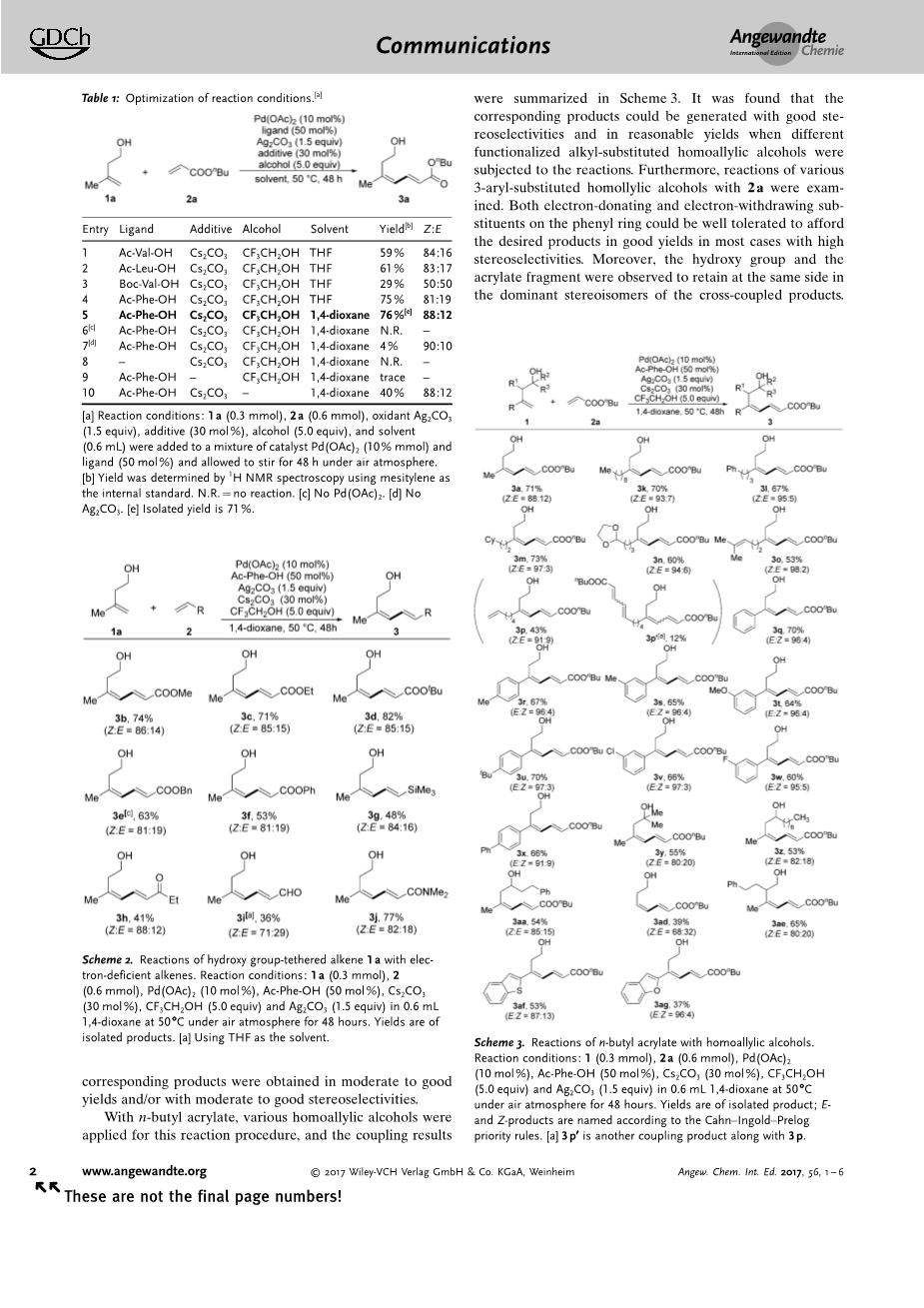 总之,钯催化的高烯丙醇与缺电子烯烃之间的氧化交叉偶联反应已经发展起来。通过对含羟基烯烃的明智选择,可以获得高度立体选择性的烯烃合成。