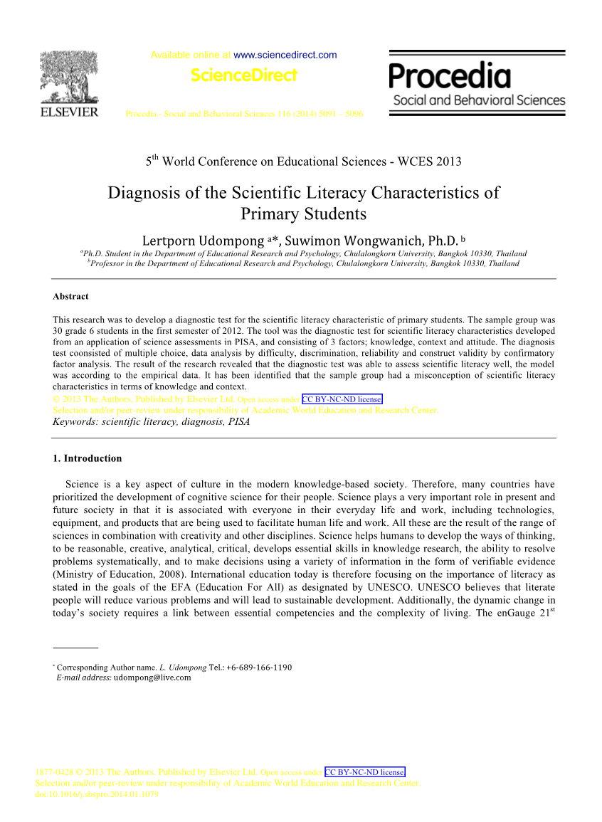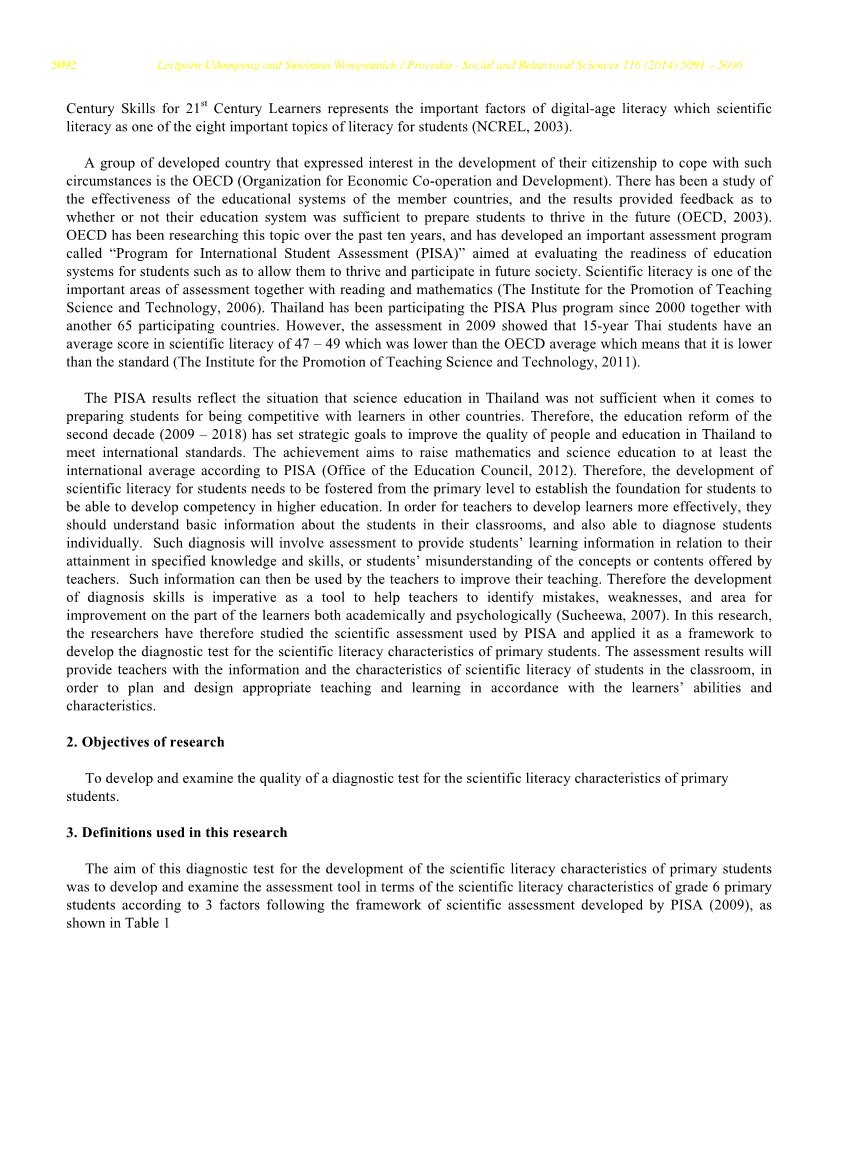 国际学生评估项目的结果反映了这样一种情况,即在培养学生与其他国家学生的竞争能力方面,泰国的科学教育是不够的。因此,《泰国教育改革第二个十年(2009~2018年)》制定了战略目标,提高泰国的人员素质和教育质量,达到国际标准。根据PISA(教育委员会办公室,2012),该成就旨在提高数学和科学教育,至少提高至国际平均水平。因此,要从小学开始培养学生的科学素养,为学生在高等教育中发展能力奠定基础。为了让教师更有效地培养学生,他们应该了解学生在课堂上的基本信息,并能够对学生进行个别诊断。这种诊断将涉及评估学生获取特定知识和技能的学习信息,或学生对来自教师的概念或内容的误解。这样的信息可以用于教师改进教学。因此,诊断技能的发展是必不可少的,它可以作为帮助教师识别学习者在学术和心理上的错误、弱点和需要改进之处的一种工具(Sucheewa, 2007年)。因此,在这项研究中,研究人员研究了PISA所使用的科学评估,并将其作为一个框架来开发小学生科学素养特征的诊断测试。评估结果将为教师提供课堂上学生科学素养的信息和特点,以便根据学习者的能力和特点来规划和设计合适的教与学。