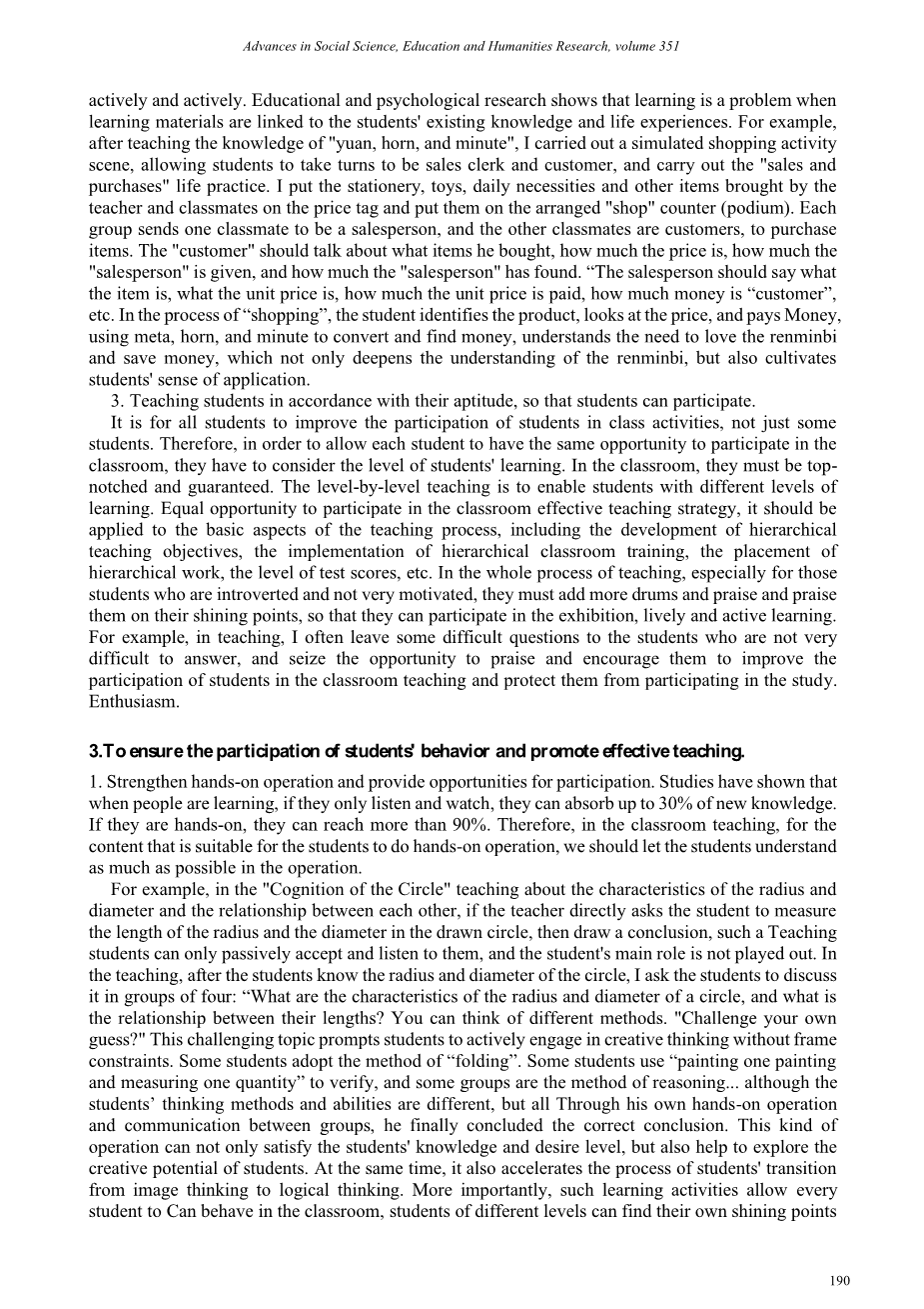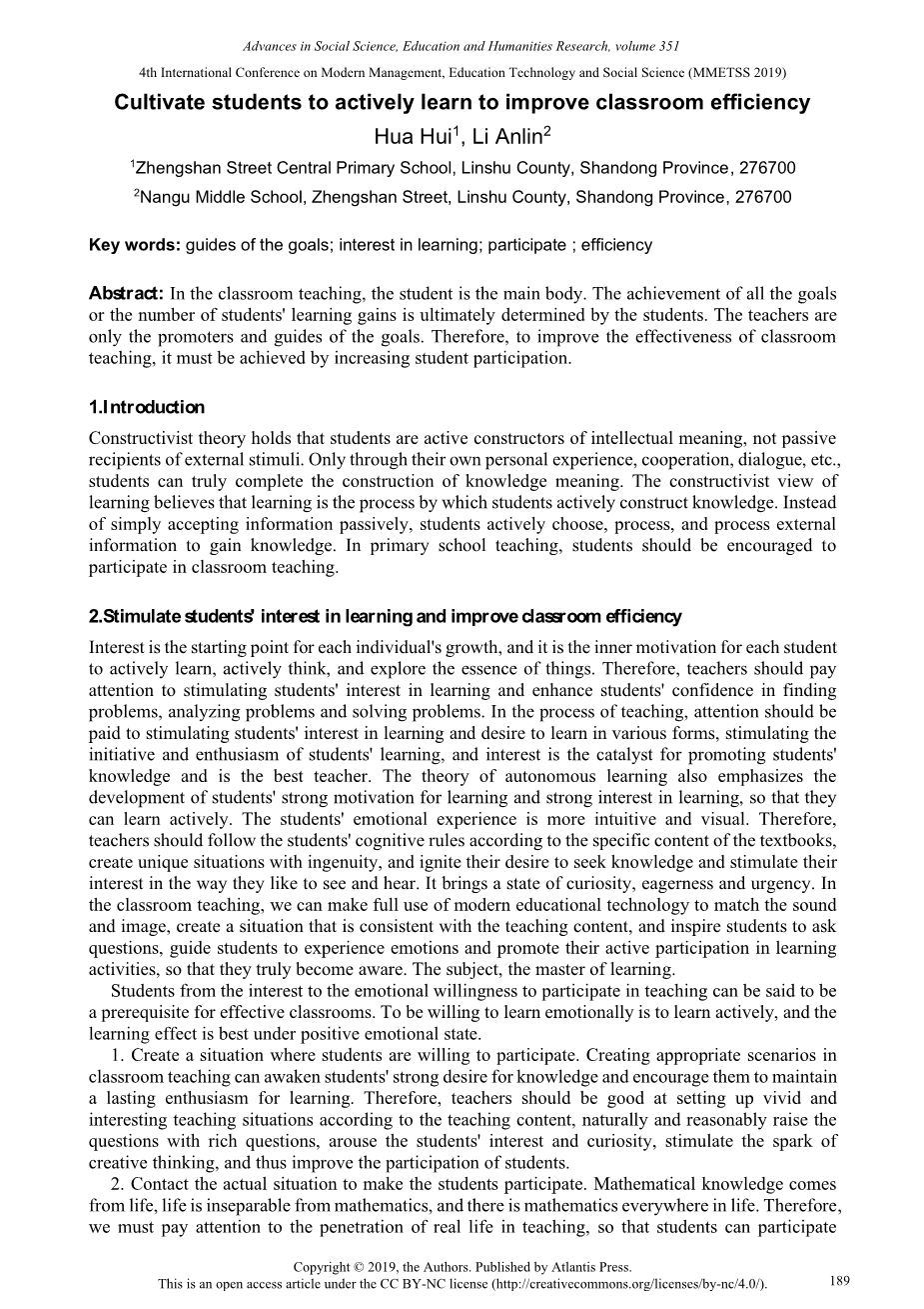 Hua Hui,Li Anlin. Cultivate students to actively learn to improve classroom efficiency[C]//.Proceedings of 4th International Conference on Modern Management,Education Technology and Social Science(MMETSS 2019)(Advances in Social Science, Education and Humanities Research, VOL.351),2019: 190-193.DOI:10.26914/c. cnkihy.2019.067269.