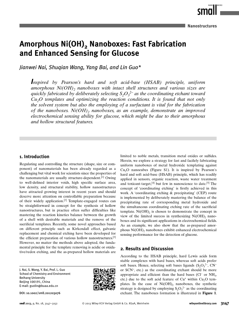 摘要:受皮尔逊软硬酸碱(HSAB)原理的启发,通过对Cu2O模板的配位蚀刻剂S2O2- 3的选择和优化反应条件,快速制备了具有完整壳结构和各种尺寸的均匀非晶Ni(OH)2纳米盒。研究发现,不仅是溶剂体系,表面活性剂的使用对纳米盒的制备至关重要。以Ni(OH)2纳米盒为例,表明其对葡萄糖的电化学传感能力有所提高,这可能是由于其非晶态和中空结构的特点。