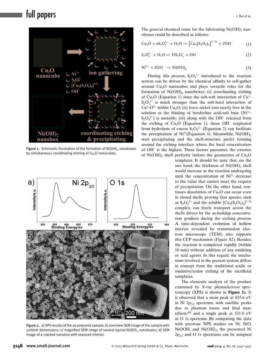在此过程中,向反应体系中引入的S2O2- 3在化学亲和性的驱动下,自聚集在Cu2O纳米立方体周围,对Ni(OH)2纳米盒的形成起着多种作用:(1) 在Cu2O的配位刻蚀中,Cu S2O2- 3的软-软相互作用要比Cu - O2-的软-硬相互作用强得多(方程式1);(ii)溶液中镍离子几乎处于游离状态,边界酸软碱(Ni2 - S2O2- 3)的结合不稳定;(iii)随着Cu2O(方程式1)的蚀刻释放OHminus;,过剩的S2O2- 3(方程式2)水解产生的OHminus;有利于Ni 2 的析出(方程式3)。同时,Ni(OH)2开始析出,在OHminus;浓度最高的刻蚀界面附近形成壳层结构。这些因素保证了Ni(OH) 2壳的外观能很好地模仿Cu2O模板的几何形状。需要注意的是,一方面,Ni(OH)2壳层厚度会随着反应的进行而增加,直到Ni 2 浓度降低到不能满足沉淀要求的值。另一方面,继续溶解Cu2O甚至可以发生在封闭的壳,证明物种,如S2O2- 3和可溶性[Cu2(S2O3)x]2minus;2x复杂,可以自由运输穿过外壳由as-buildup浓度梯度在腐蚀过程中。透射电子显微镜(TEM)显示中空内部随时间变化的演化也支持这种CEP机制(图2)。而且,该反应非常快(10分钟内),无需其他氧化剂或酸剂。在这方面,目前系统中涉及的机制在概念上不同于传统的酸性或氧化/氧化还原刻蚀牺牲模板。x射线光电子能谱(XPS)对产物的元素分析如图2a所示。在Ni 2p3/2光谱中,在855.6 eV处有一个主峰,由于等离子体损耗和最终态效应,有一个卫星峰;在O 1s谱中,在531.0 eV处有一个单峰。通过与前人对Ni(OH)2、NiO、NiOOH和Ni(OH)2的XPS研究结果的比较,发现Ni 2p 3/2和O 1s谱可以分别归属于Ni(OH)2中的Ni2 和OH-。因此,很明显,Ni(OH)2是在本实验条件下形成的。通过X射线粉末衍射(XRD)对Ni(OH)2纳米盒的晶体结构和相纯度进行了评价,如图3所示。由于合成过程是在室温下进行的,因此样品具有预期的非晶态特征。图2b中的扫描电子显微镜(SEM)全景图显示,样品由均匀的纳米盒组成,没有杂质颗粒或聚集物。扫描电镜(SEM)图像显示了Ni(OH)2纳米盒的清晰结构(图2c)。小颗粒构成了边缘长度为450 ~ 500 nm的立方壳结构,继承了Cu2O纳米盒的几何形状和尺寸。如图2d所示,裂纹纳米盒的内部空间也可以直接看到。这些纳米盒的开裂可能是由于Cu2O在快速溶解过程中通过壳层的快速质量转移引起的。通过TEM图像进一步研究制备的Ni(OH)2纳米盒的中空内部和建筑结构,如图3所示。从图像中可以观察到纳米盒的高度均匀性,这与图2b中的SEM结果一致。通过壳体和中空内部的对比,可以清楚地看出纳米盒的内部空腔。由于初始溶液中Ni 2 含量较低,纳米盒的外壳薄至35 ~ 45 nm。虽然反应进行得相当快,但不会发生结构变形,如翘曲或坍塌。相反,纳米盒很好地模仿了Cu2O模板的立方结构,表面相对光滑,没有明显的开口。选区电子衍射(SAED)图也显示了纳米盒的非晶态特征,与XRD结果一致。