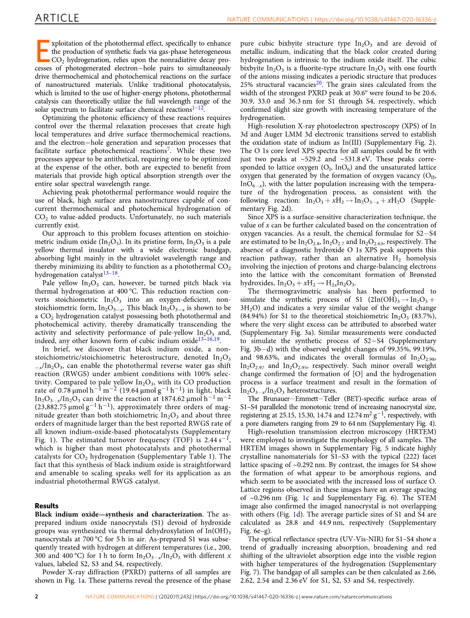 我们解决这个问题的方法将集中在化学计量的氧化铟(In2O3)上。在其原始形式中,In2O3是一种淡黄色的热绝缘体,具有宽电子带隙,主要吸收紫外波长范围内的光,从而很大限度地降低其作为光热CO2加氢催化剂的能力。
