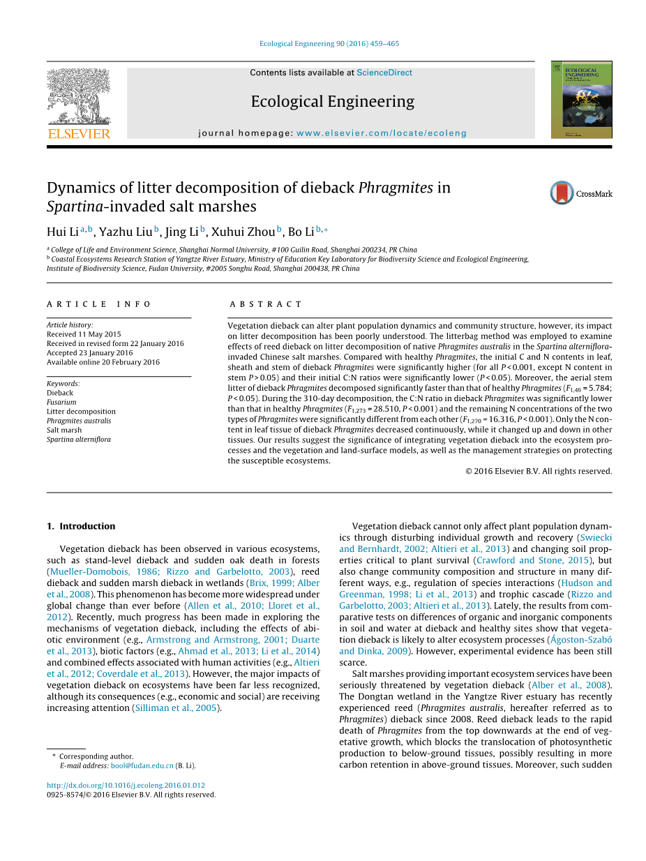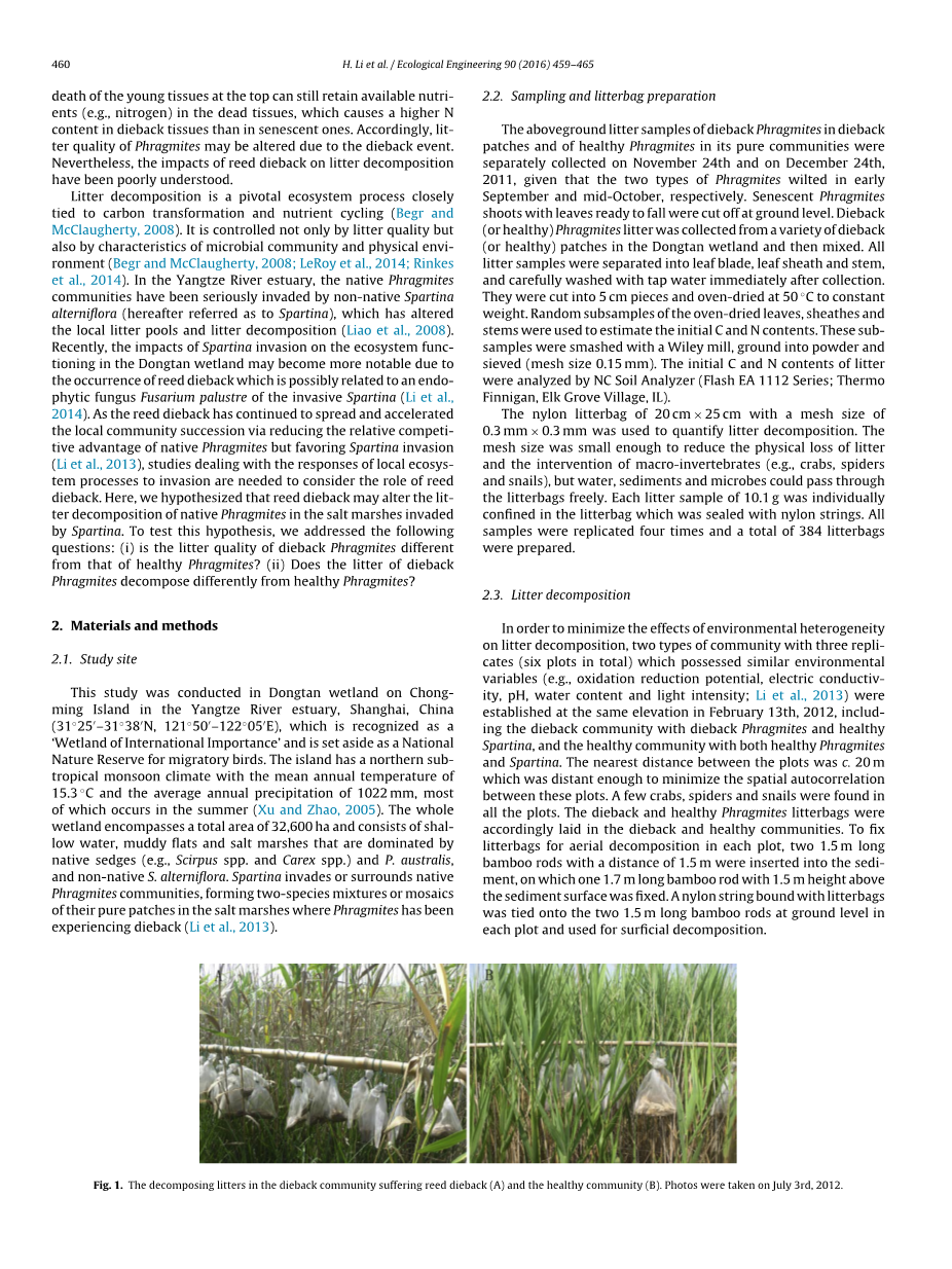 提供重要的生态系统服务的盐沼严重受到植被顶枯病的威胁(Alber et al., 2008)。长江口东滩湿地近期自2008年芦苇(Phragmites australis,以下简称Phragmites)开始减少。芦苇顶枯病导致植物顶端的快速枯萎,这阻止了光合作用的产物转运到地下组织,可能导致更多碳在枯萎组织中的滞留。此外,顶部的年轻组织的突然死亡但仍能在死亡组织中保留有效的养分(例如氮),这会导致顶枯病的组织比衰老的组织有更高的氮含量。因此,由于芦苇顶枯病,芦苇的质量可能会更低。尽管如此,芦苇顶枯病对凋落物分解的影响仍知之甚少。