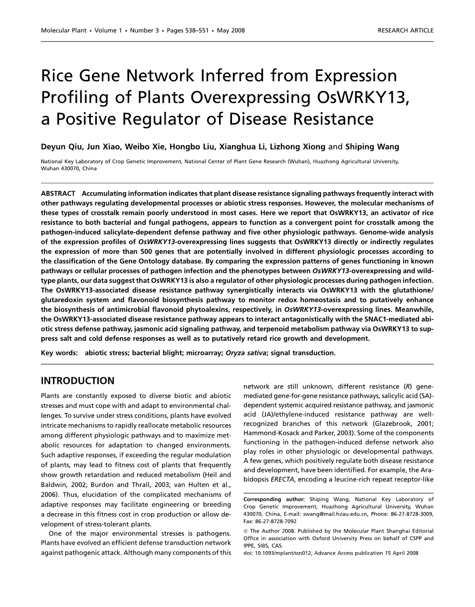 Corresponding author: Shiping Wang, National Key Laboratory of Crop Genetic Improvement, Huazhong Agricultural University, Wuhan 430070, China, E-mail:swang@mail.hzau.edu.cn,Phone:86-27-8728-3009,Fax:86-27-8728-7092The Author 2008. Published by the Molecular Plant Shanghai Editorial Office in association with Oxford University Press on behalf of CSPP and IPPE, SIBS, CAS.