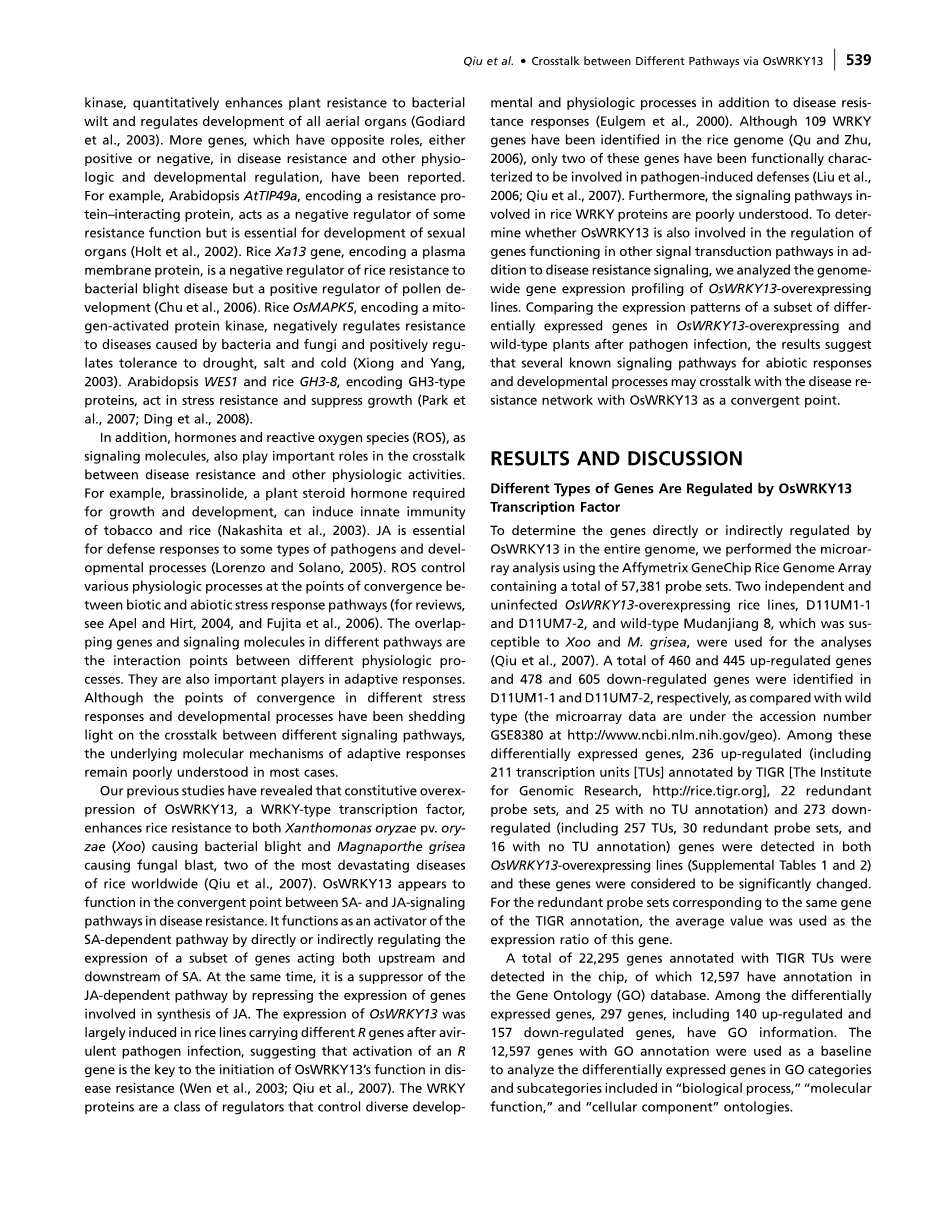 Rice Gene Network Inferred from Expression Profiling of Plants Overexpressing OsWRKY13, a Positive Regulator of Disease Resistance
