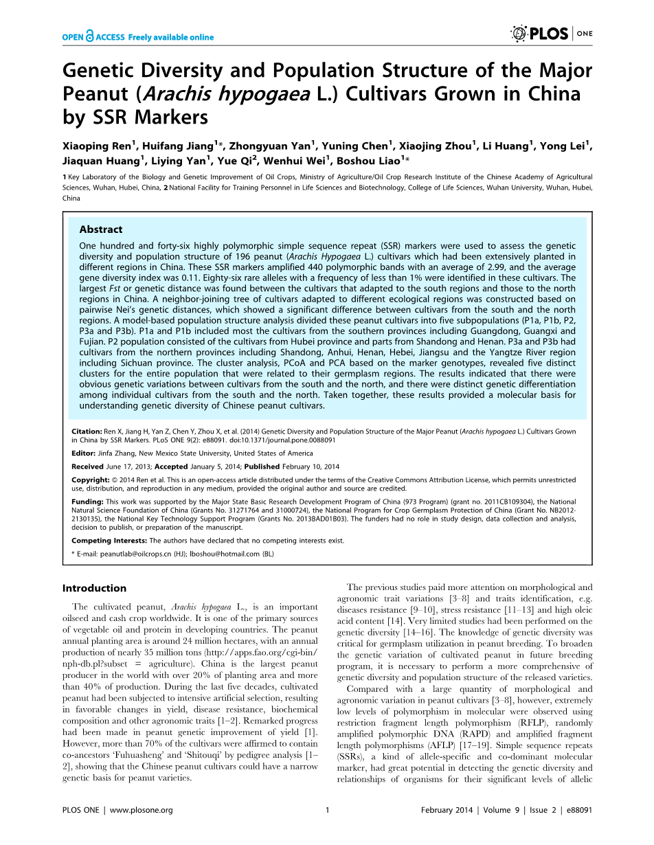 引文:Ren X, Jiang H, Yan Z, Chen Y, Zhou X,等,(2014)基于SSR标记的中国本土栽培种花生(落花生)的遗传多样性和种群结构。