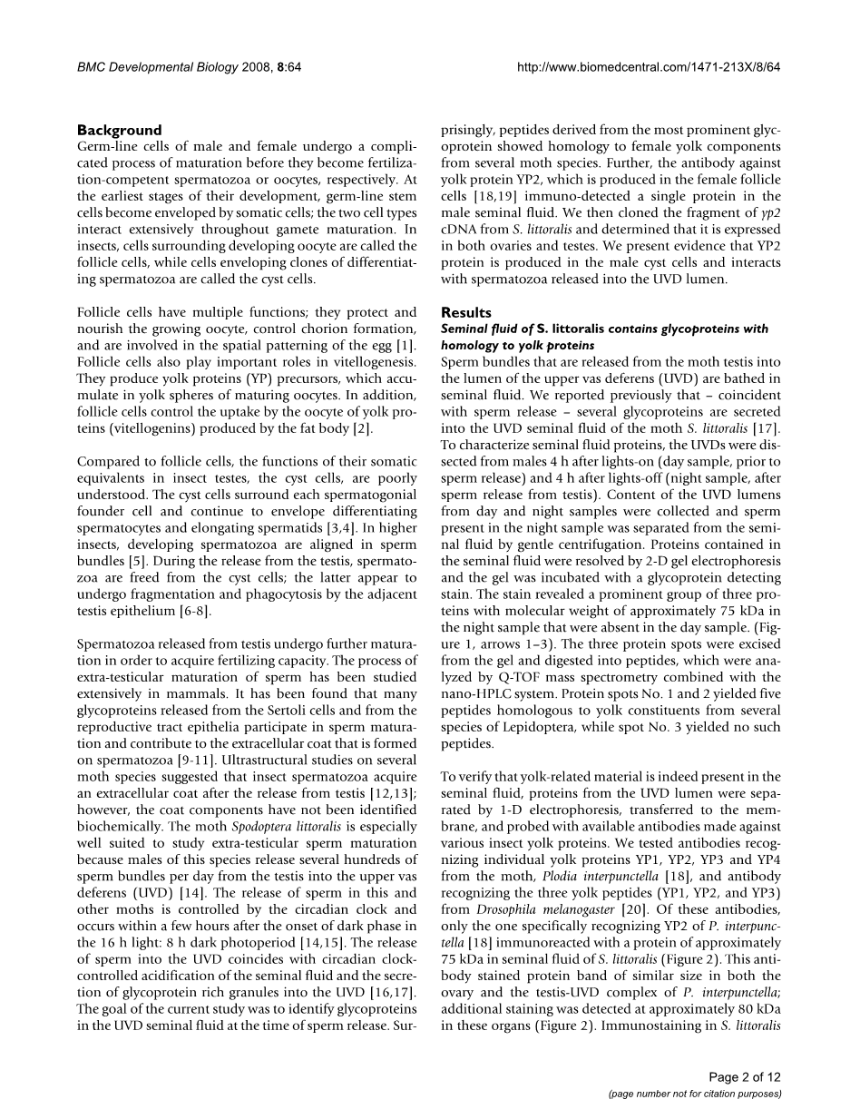 与卵泡细胞相比,它们在昆虫睾丸(囊肿细胞)中的体细胞等价物的功能知之甚少。 囊细胞围绕每个精原细胞的创始细胞,并继续包裹分化的精母细胞和延长的精子细胞[3,4]。 在较高的昆虫中,发育中的精子在精子束中排列[5]。 在睾丸释放期间,精子从囊肿细胞中释放出来; 后者似乎经历相邻睾丸上皮细胞的破碎和吞噬作用[6-8]。从睾丸释放的精子经过进一步的成熟以获得受精能力。已经在哺乳动物中广泛研究了精子睾丸外成熟的过程。已经发现,从支持细胞和生殖道上皮细胞释放的许多糖蛋白参与精子成熟并促成精子上形成的细胞外膜 [9-11]。对几种飞蛾物种的超微结构研究表明, 昆虫精子在从睾丸中释放后获得细胞外膜[12, 13];然而, 涂层成分还没有被生化鉴定出来。飞蛾头颅是特别适合研究睾丸外精子成熟, 因为这个物种的男性释放几百个精子束每天从睾丸进入上输精管 (UVD) [14]。精子在这和其他飞蛾中的释放是由生物钟控制的, 发生在16h 光的黑暗阶段开始后的几个小时内: 8小时黑暗光周期 [14, 15]。精子释放到 UVD 与生理时钟控制的酸化和糖蛋白丰富颗粒分离到 UVD [ 16 , 17 ] 。目前研究的目的是在精子释放时识别 UVD 中的糖蛋白。值得注意的是,来自最显着的糖蛋白的肽显示出与来自几种蛾类的雌性蛋黄成分的同源性。 此外,在雌性卵泡细胞中产生的抗卵黄蛋白YP2的抗体[18,19]免疫检测雄性精液中的单一蛋白质。 然后我们克隆了来自S. littoralis的yp2 cDNA片段,并确定它在卵巢和睾丸中均有表达。 我们提出证据表明YP2蛋白在雄性囊肿细胞中产生并与释放到UVD腔中的精子相互作用。结果