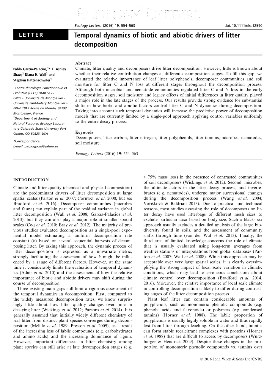 现在,对分解过程时间动态的准确分析仍然受到三个主要缺口的限制。首先,与广泛测量的分解速率相比,我们对凋落物的质量如何随时间变化知之甚少(Wickings et al. 2012; Parsons et al. 2014)。一般认为,不同植物凋落物的化学性质在分解过程中会发生趋同(Melillo et al. 1989; Preston et al. 2009),如不稳定化合物(如碳水化合物和氨基酸)损失的增加和木质素的优势地位的增加。然而,在与土壤分解者相对群落存在的情况下,植物物种之间凋落物化学性质的重要差异仍然可以在分解后期出现(例如gt;75%的质量损失)(Wickings et al. 2012)。其次,微生物是凋落物分解过程的最终参与者,无脊椎动物(如线虫)在分解过程中参与了重要演替变化(Wang et al. 2004;Voriskova amp; Baldrian 2013)。由于现实和技术上的原因,大多数评估分解者在凋落物分解中作用的研究都使用不同网格大小的凋落盒来排除不同个体大小的特定类群。这种凋落盒方法通常不包括对土壤中发现的大量生物多样性的详细分析,以及对群落随时间变化的评估(van der Wal et al. 2013)。最后,第三个方面是气候,由于对气候作用的有限认识,常用气象站的长期平均值或全球数据库的数据进行评估(Parton et al. 2007; Wall et al. 2008)。虽然这种方法在非常大的空间尺度上是可以接受的,但很明显,它过于简化了气候条件中局部尺度变化的强烈影响,这可能导致气候控制代谢过程的片面化的错误结论(Bradford et al. 2014,2016)。此外,在凋落物降解过程的不同阶段,局部气候尺度控制作用的相对重要性可能有所不同。