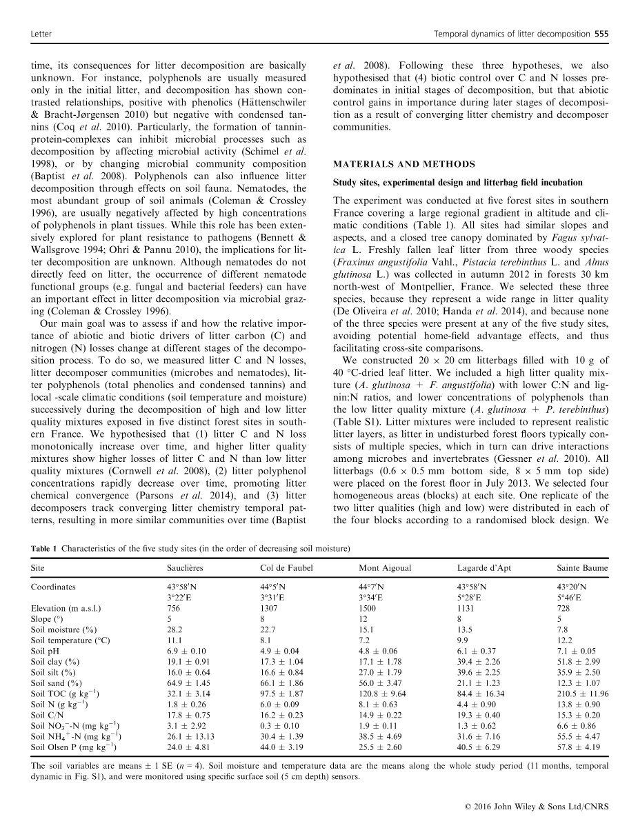 我们的主要目标是评估在凋落物降解的不同阶段生物因子和C损失,N损失等非生物因子的相关重要性是否发生变化。为了达到这个目的,我们成功地测量了法国南部五个不同的森林地点高、低凋落物混合物分解过程中凋落物C和N损失,凋落物降解群落(细菌和线虫),凋落物多酚(总酚类物质和浓缩丹宁酸)和当地气候条件(土壤温度和湿度)。我们假设(1)在降解过程中凋落物C和N损失一直单调增加并且高凋落物质量的混合物比低凋落物质量的混合物C和N损失要更多 (Cornwell et al. 2008),(2)凋落物多酚多聚物浓度随时间推移下降,促进凋落物降解 (Parsons et al. 2014),和(3)凋落盒使凋落物中化学成分变化模式趋合,使得随时间变化,形成更相似的群落(Baptist et al. 2008)。根据这三个假设,我们假设(4)对C和N损失的生物防治在代谢的初级阶段起主导作用,但这种非生物的防治在凋落物降解后期由于化学成分和降解群落的趋同也取得了重要作用。