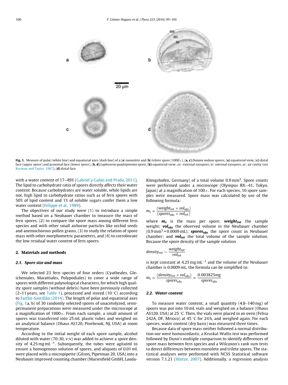 为了测量含水量,将少量孢子(4.8–140 mg)放入10毫升小瓶中,在25°C条件下于天平上称重(OhausAS120,美国)。然后,将小瓶放在烘箱中(费利萨242A,DF,墨西哥)45℃下的条件下24小时,再次称重,重复三次。由于孢子质量的数据既不服从正态分布,也不均匀,所以进行了Kruskal-Wallis试验,以及多重比较。用NCSS统计软件进行统计分析版本7.1.21(Hintze,2007)。另外,回归分析进行了调查,以了解孢子赤道轴和极轴的长度与孢子质量之间的关系。使用table curve 2D 版本3(AISN软件,美国伊利诺伊州芝加哥)对模型进行拟合。