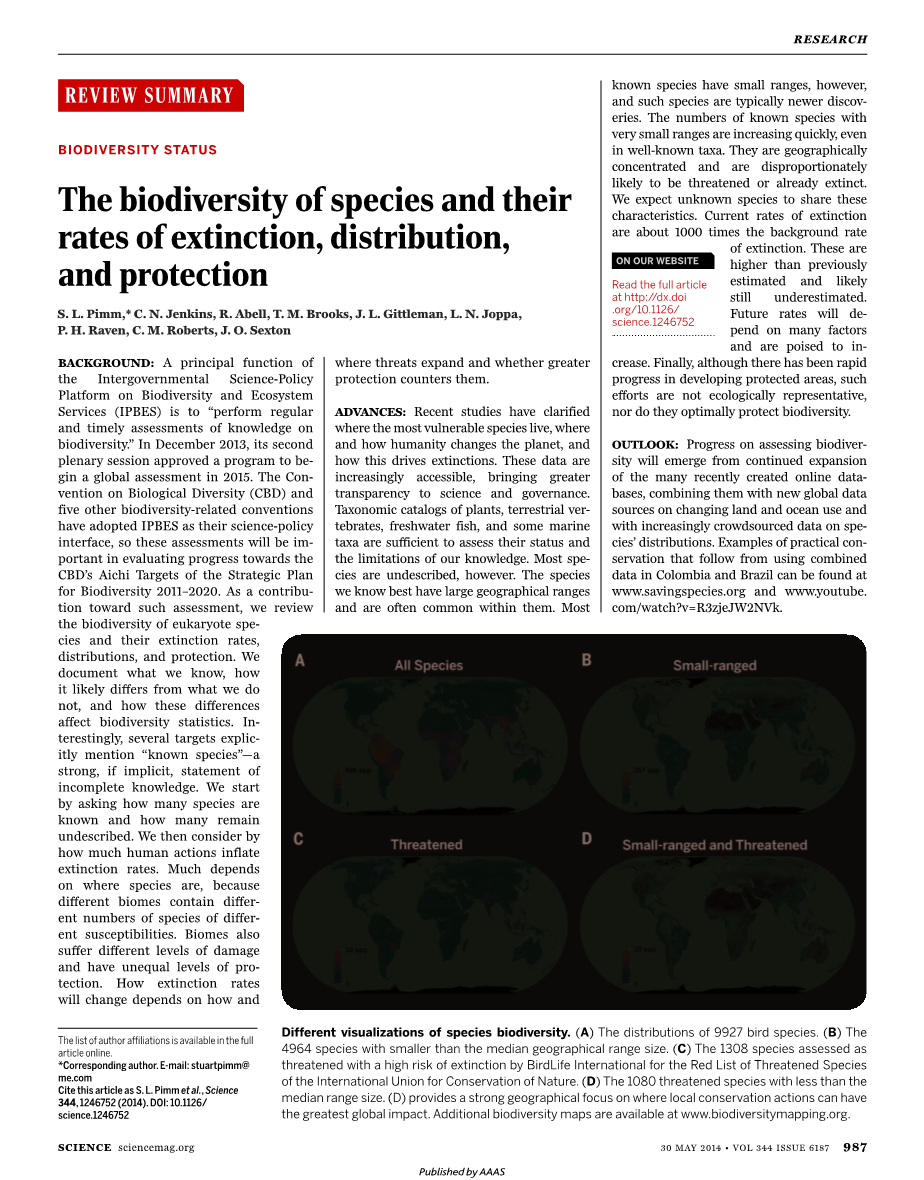 最近的研究说明了最稀缺的物种生活在哪里,人类在哪里以及如何改变地球,以及这如何导致物种灭绝。这些数据越来越容易获得,为科学和治理带来了更大的透明度。其中植物,陆生脊椎动物,淡水鱼和一些海洋生物分类的分类目录足以表明其地位和我们所掌握知识的局限性。但是,大多数物种没有被描述。我们最了解的物种分布很广泛且大多具有共同点。但是,已知濒危物种的范围很小,并且这些物种通常是较新的发现。在已知的分类中,甚至在著名的分类单元,范围很小的濒危物种的数量也在迅速增加。它们在地理上非常集中,极有可能受到威胁或已经灭绝。我们希望未知物种也具有这些特征。目前的灭绝速度约为本底率的1000倍。这些比以前估计的更高并且可能仍然被低估。未来的速率将取决于许多因素,并将继续上升。最后,尽管在开发保护区方面取得了迅速的进展,但这种努力在生态上没有代表性,也不能最佳地保护生物多样性(1)。