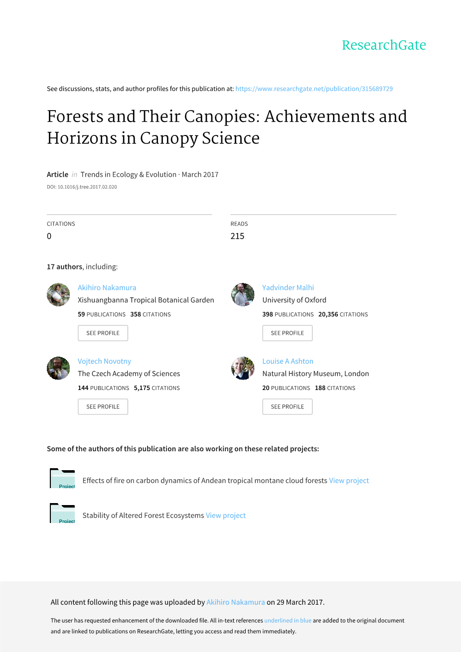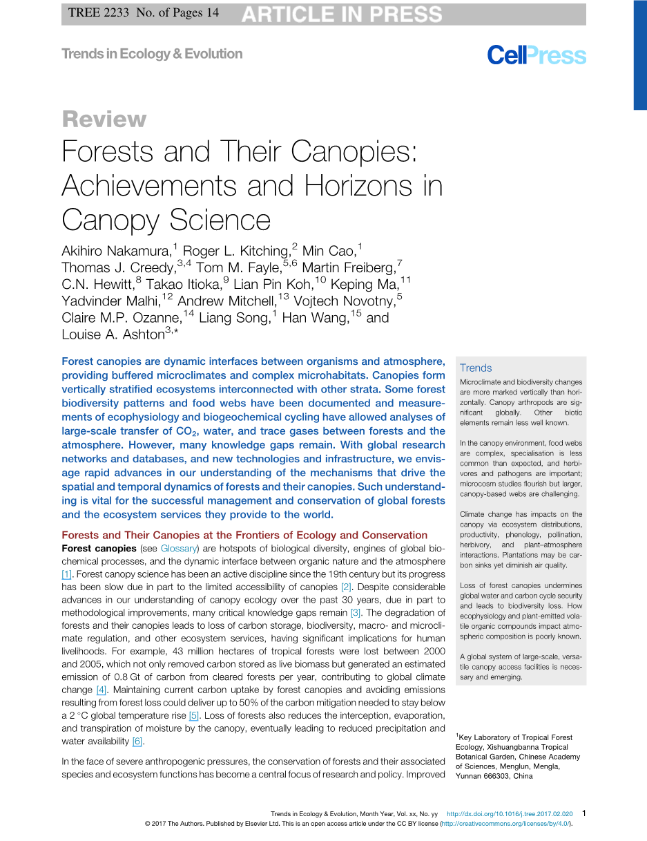 森林及其冠层:冠层科学的成就和视野 Akihiro Nakamura,1 Roger L. Kitching,2 Min Cao,1 Thomas J. Creedy,3,4 Tom M. Fayle,5,6 Martin Freiberg,7 C.N. Hewitt,8 Takao Itioka,9 Lian Pin Koh,10 Keping Ma,11 Yadvinder Malhi,12 Andrew Mitchell,13 Vojtech Novotny,5 Claire M.P. Ozanne,14 Liang Song,1 Han Wang,15 and Louise A. Ashton3,*