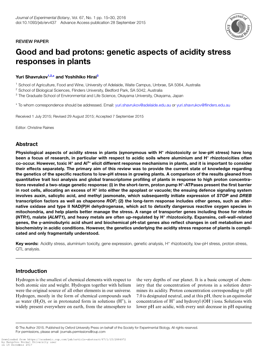 摘要:植物中酸性胁迫的生理方面(与H 根瘤毒性或低pH胁迫同义)长期以来一直是研究的焦点,特别是对于其中铝和H 根瘤毒性常常共同发生的酸性土壤。然而,毒性H 和Al3 在植物中引起不同的反应机制,因此分开考虑它们的作用是很重要的。本篇综述的主要目的是提供关于植物生长对低pH胁迫的特异性反应遗传学的最新知识。从数量性状位点分析收集的结果与响应于高质子浓度的植物全局转录组分析的比较揭示了两阶段遗传响应:(1)在短期内,质子泵H -ATP酶在根细胞中呈现第一屏障,将过量的H 分配到质外体或液泡中; 随后的防御信号系统涉及生长素,水杨酸和茉莉酸甲酯,其随后启动STOP和DREB转录因子以及伴侣ROF的表达; (2)长期反应包括其他基因,如替代氧化酶和II型NAD(P)H脱氢酶,其作用是解毒线粒体中危险的活性氧,帮助植物更好地控制压力。包括硝酸盐(NTR1),苹果酸盐(ALMT1)和重金属在内的一系列转运蛋白基因常常受到H 根瘤毒性的上调。扩展蛋白,细胞壁相关基因,gamma;-氨基丁酸分流和生化pH-stat基因也反映了酸性条件下细胞代谢和生物化学的变化。然而,植物酸性胁迫反应的遗传基因是复杂的,只有片段理解。