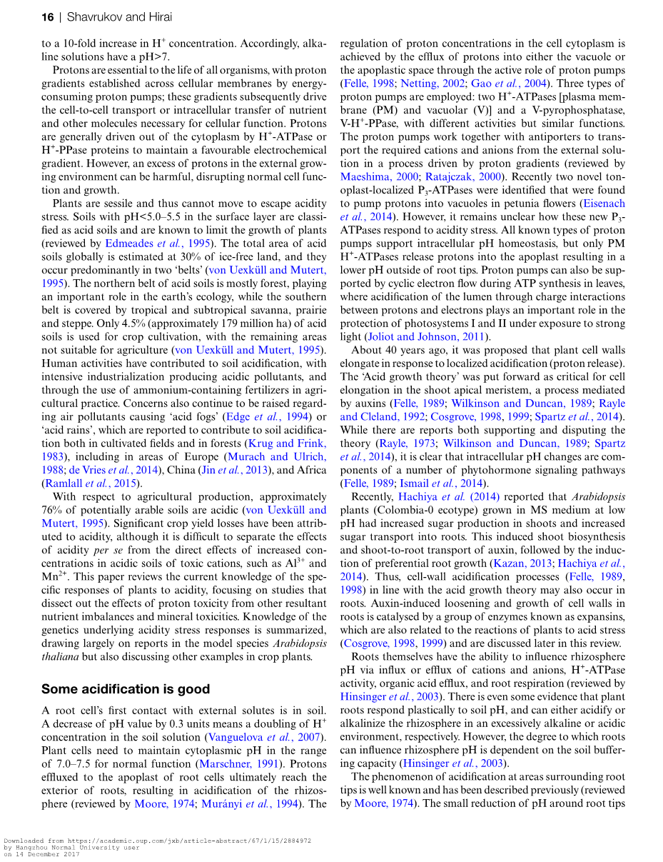就农业生产而言,约76%的潜在耕地土壤呈酸性von Uexkuuml;ll and Mutert, 1995)。显着的作物产量损失归因于酸度,尽管难以将酸性本身的影响与有毒阳离子(如Al3 和Mn2 )在酸性土壤中浓度增加的直接影响分开。本文回顾了植物对酸度的特殊反应的现有知识,重点研究解析其他营养不平衡和矿物毒性导致的质子毒性效应的研究。总结了酸碱胁迫反应基因的遗传基础知识,主要于模式物种拟南芥研究,还讨论了作物植物中的其他示例。