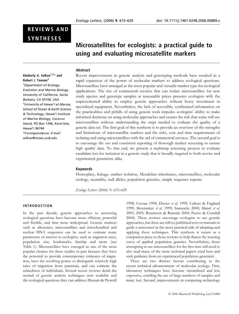 原文作者 Kimberly A. Selkoe1,2 * and Robert J. Toonen2