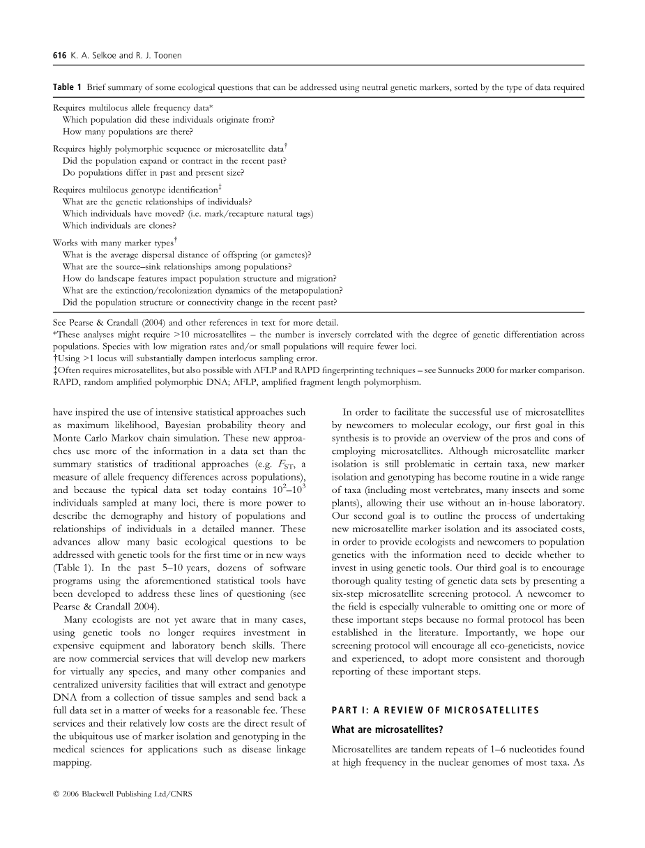 不管这些问题,分子标记必须从根本上是选择中性并遵循孟德尔遗传规律才能被用来作为一种工具,用于检测人口结构,且这些特征应始终用以确认任何标识类型(见第三部分:一个微卫星筛选方案)。
