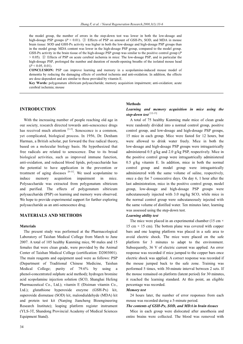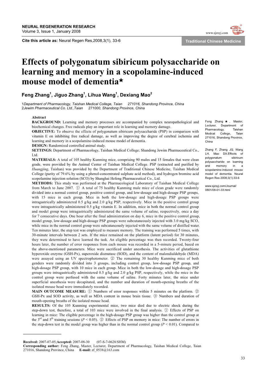 Effects of polygonatum sibiricum polysaccharide on learning and memory in a scopolamine-induced mouse model of dementia[J]. Neural Regeneration Research, 2008(1): 33-36.
