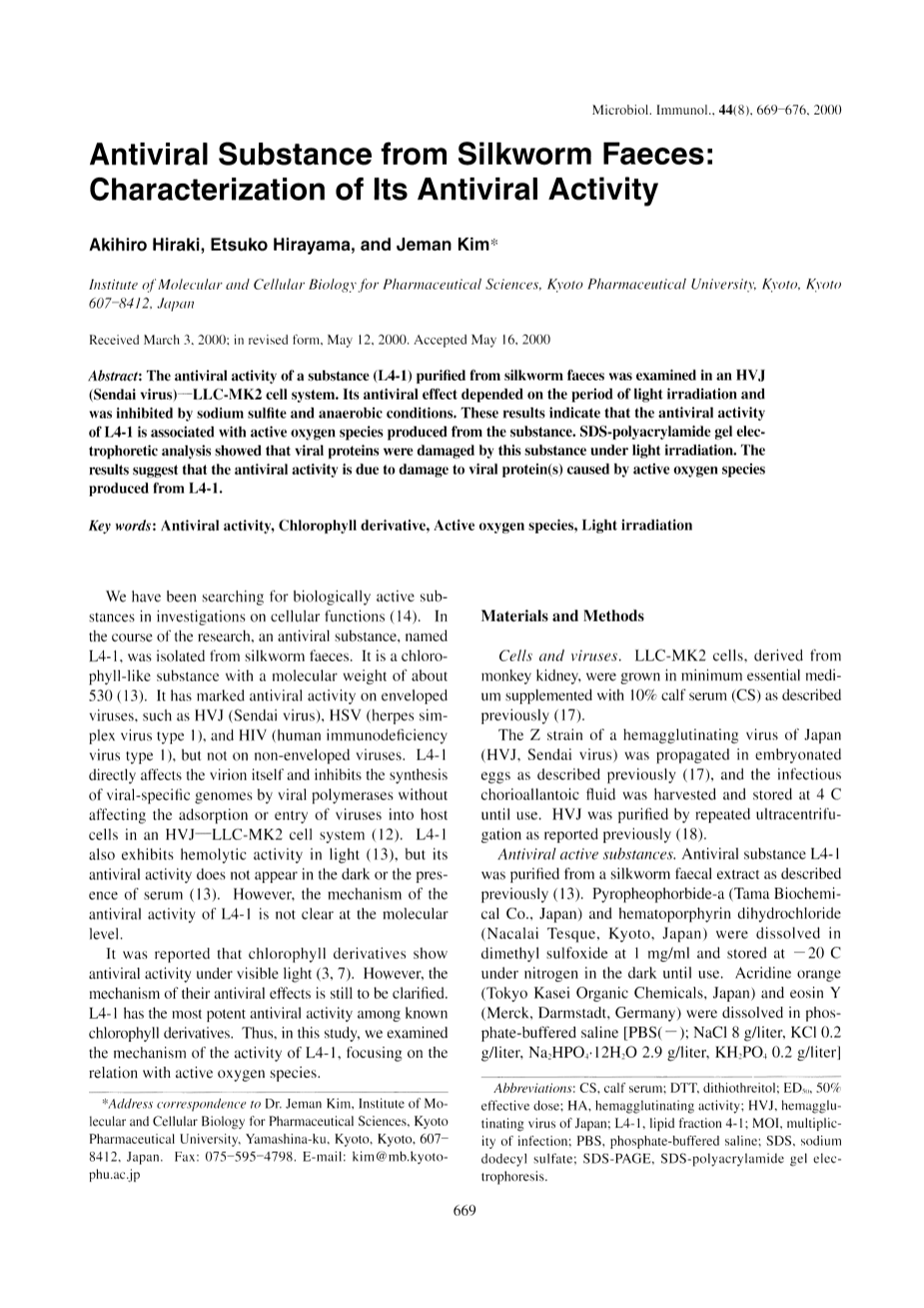对于细胞功能的研究,我们一直在寻找某种具生物活性的物质。在研究过程中,一种命名为L4-1的抗病毒物质,是从蚕的粪便中分离的。它是一种类似于叶绿体的物质,分子量约为530。它能在包膜病毒上标记抗病毒活性,如HVJ(仙台病毒),HSV(单纯疱疹病毒1型),和HIV(人类免疫缺陷病毒1型),但不能标记在非包膜病毒。L4-1能直接影响病毒粒子本身,并且抑制由病毒聚合酶控制的病毒特异性基因组的合成,而不会影响HVJ-LLC-MK2细胞系统的吸附或病毒进入宿主细胞。L4-1在光照条件下也显示出溶血活性,但它的抗病毒活性没有出现在黑暗中,也不存在于血清。然而,L4-1的抗病毒活性的机制在分子水平上还不是很清楚。