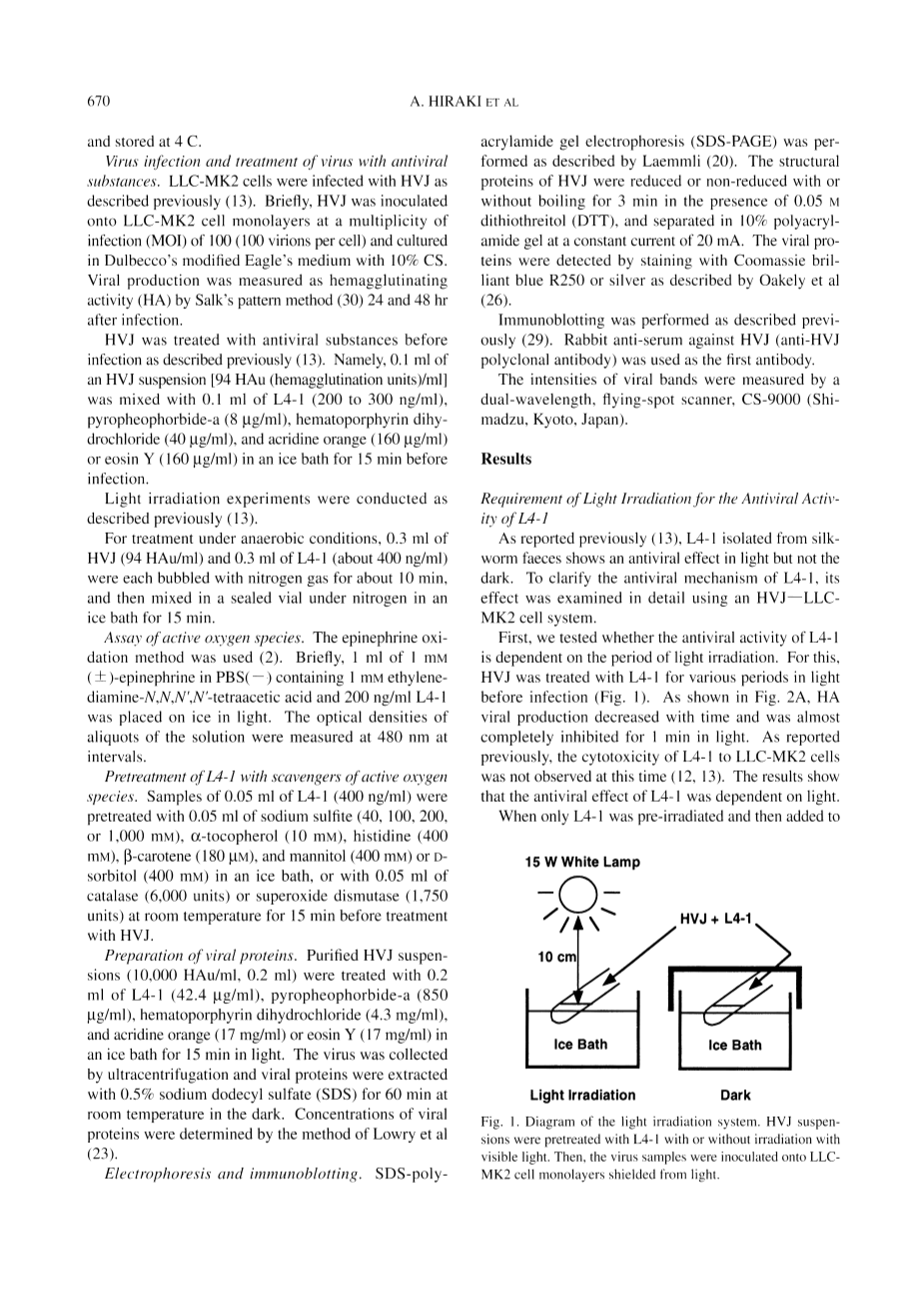 一般情况下,L4-1似乎只对包膜病毒有效。最近,我们认识到,L4-1也能灭活流感病毒,它是一种包膜病毒。这表明病毒包膜成分对于L4-1的抗病毒活性是必要的。活性氧据报道能生成有毒的烷基自由基和脂质的过氧自由基。此外,来自于脂质过氧化物的4-羟基壬烯醛能显著损伤基本的氨基酸、组氨酸或赖氨酸,并能使酶失活。经L4-1处理后,经酸性染料染色后,大多数的HVJ蛋白条带未被检测到。这一发现表明,组成HVJ蛋白的 一些基本的氨基酸改变了。因此,其对一个新的有毒物质的抗病毒作用的可能性仍然存在,这个新的有毒物质是由一些包膜病毒的脂质产生的,如4-羟基壬烯醛。