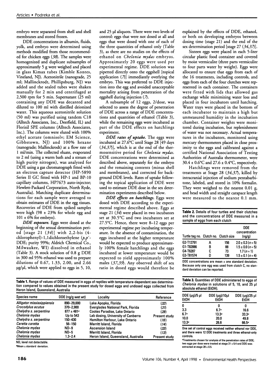 卵的给药是在性别决定期开始(21期),用2,2-二(4-氯苯基)- 1,l二氯乙烯(P,Prsquo;—DDE;纯度99%;Aldrich Chemical Co., Milwaukee, WI)溶于乙醇。用在300毫升95%乙醇0.8 g DDE的原液准备0.67,1.33,2.00,和2.66 mu;g/mu;l的稀释,并应用于鸡蛋5,10,和25 mu;l的等分。这有两级控制:没有进行给药的卵和给予一个三个数量的乙醇(表3)的卵,因为还没有实验对绿海龟胚胎的乙醇影响进行研究。大约有20个卵用于每个实验的制度。DDE的解决方案是将直接用吸管吸到到蛋壳表面(局部应用),立即覆盖胚胎。这是首选的DDE注入鸡蛋和避免在注射中从蛋壳渗透中产生不可接受的死亡率的方法。其中一个12个卵的子样本,2 /剂量,来评估在一系列的DDE浓度和数量的乙醇(表3)中的DDE的渗透度程度,而其余的卵孵化作为在孵化时DDE的影响部分实验。