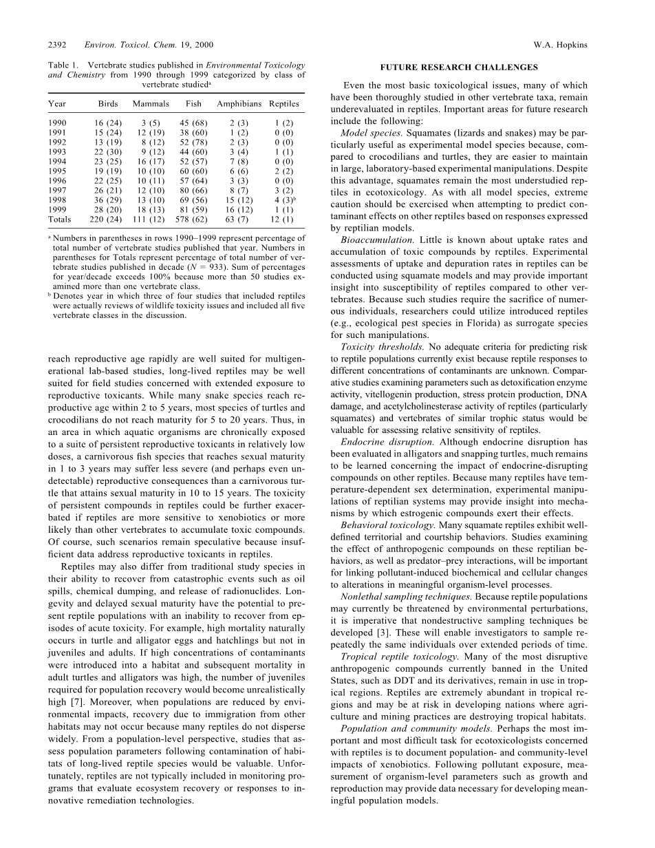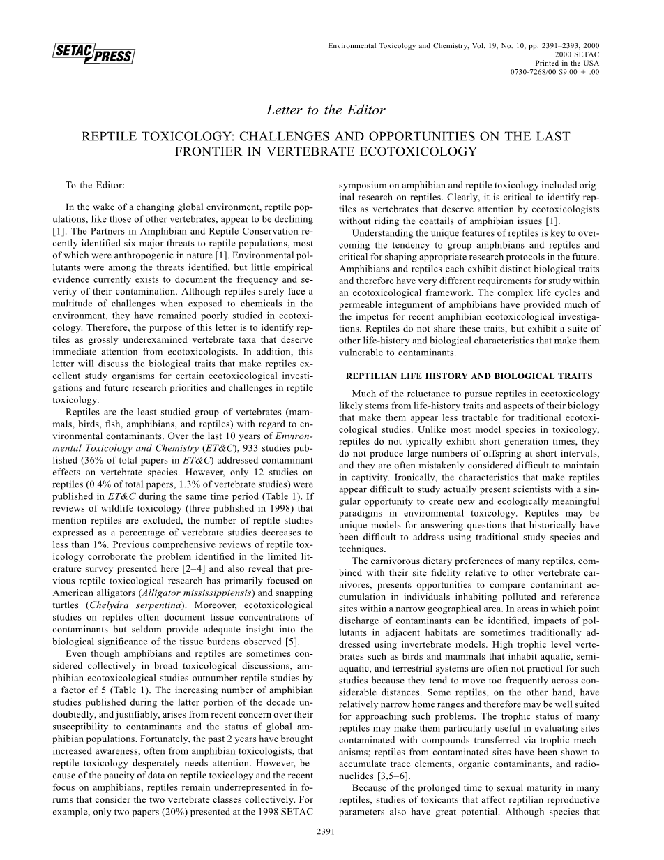 关于环境污染物,爬行动物在脊椎动物(哺乳动物、鸟类、鱼类、两栖动物和爬行动物)中研究最少。过去10年,在环境毒理学和化学(ETamp;C)领域,共发表了993篇(ETamp;C论文总数的36%)关于污染物对脊椎动物影响的研究报告。然而只有12篇(论文总数的0.4%,脊椎动物研究的1.3)爬行动物的研究报告在同一时间段内在ETamp;C上发表(表1)。如果将提及爬行动物的野生动物毒理学综述(3篇在1998年发表)排除在外,爬行动物研究的数量减少到不足脊椎动物研究的1%。先前全部的爬行动物毒理学综述证实的问题都被有限的文献调查所鉴定,并且揭示了先前研究的主要关注点在于美国短吻鳄(Alligator mississippiensis)和鳄龟(Chelydra serpentina)。此外,对爬行动物毒理学的研究往往记录个体组织中聚集的污染物,但对组织负担观察的生物学意义的缺少深刻理解。【5】