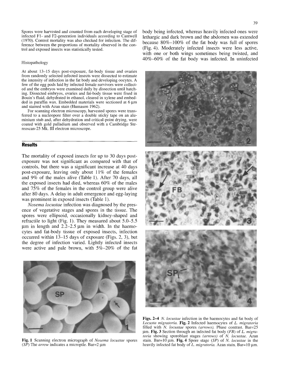 蝗虫微孢子虫在营养阶段被确诊出现,并以孢子的形式存在在在细胞组织中。孢子呈椭圆形,偶尔有肾形,并能够折射光线(如图一)。孢子长约5.0-5.5gm,宽约2.2-2.5gm。在蝗虫的血细胞和脂肪体中,感染现象在13-15天内发生(如图2,3),且逐渐恶化。感染程度较轻的蝗虫活动仍然活跃,脂肪体有5~20%的脂肪体被感染,呈浅棕色,而严重感染的个体无精打采,腹部拉长,脂肪体因为80~100%被感染而呈深褐色(如图4)。中度感染的昆虫活动不太活跃,有一到两个翅出现不正常扭曲,且体内脂肪体有40~60%被感染。未受感染的雌性蝗虫,其卵母细胞发育正常,而严重感染的雌性蝗虫,其卵母细胞通常会发生重吸收现象,轻度感染和中度感染的蝗虫体内,其卵母细胞发育也很正常,虽然大部分卵母细胞携带有处于营养阶段的微孢子(图7-9)。并未在成熟的卵母细胞或是卵细胞中观察到微孢子芽孢的形成(图10)。当胚胎发育处于生殖细胞阶段时,可在该种细胞中观察到微孢子处于营养阶段的形式存在在卵黄之中(图11)。在胚阶段,胚胎旋转180度,胚胎组织感染了微孢子,包括微孢子虫和孢子,发生胚胎的背向闭合(图12)。部分分布在卵黄囊附近的卵黄细胞也被感染(图13)。在中肠上皮细胞形成时,卵黄细胞向外围移动最终分布在中肠上皮细胞之间。一些新近形成的中肠上皮细胞因此感染到微孢子(图14)。受感染的中肠上皮细胞即使在一龄蝗蝻也能被观察到(图15)。严重感染微孢子虫的新进孵化的F1代在孵化后均死亡,而受到轻微感染的个体,则能够存活一段时间,并在之后的龄期或是达到成年后死亡。其中部分(28.4%)则能存活更长的时间,并能够产卵。新一代的死亡率数据表明,死亡率在F2时增加到了95.5%,在之后的几代人后逐渐下降,到了F7代时,其死亡率为82.8%。在F8代时,死亡率进一步下降到67.6%,但在之后的世代中(表2),相比F1和F2世代的个体中的微孢子量,各世代各龄期的微孢子平均量逐渐上升。
