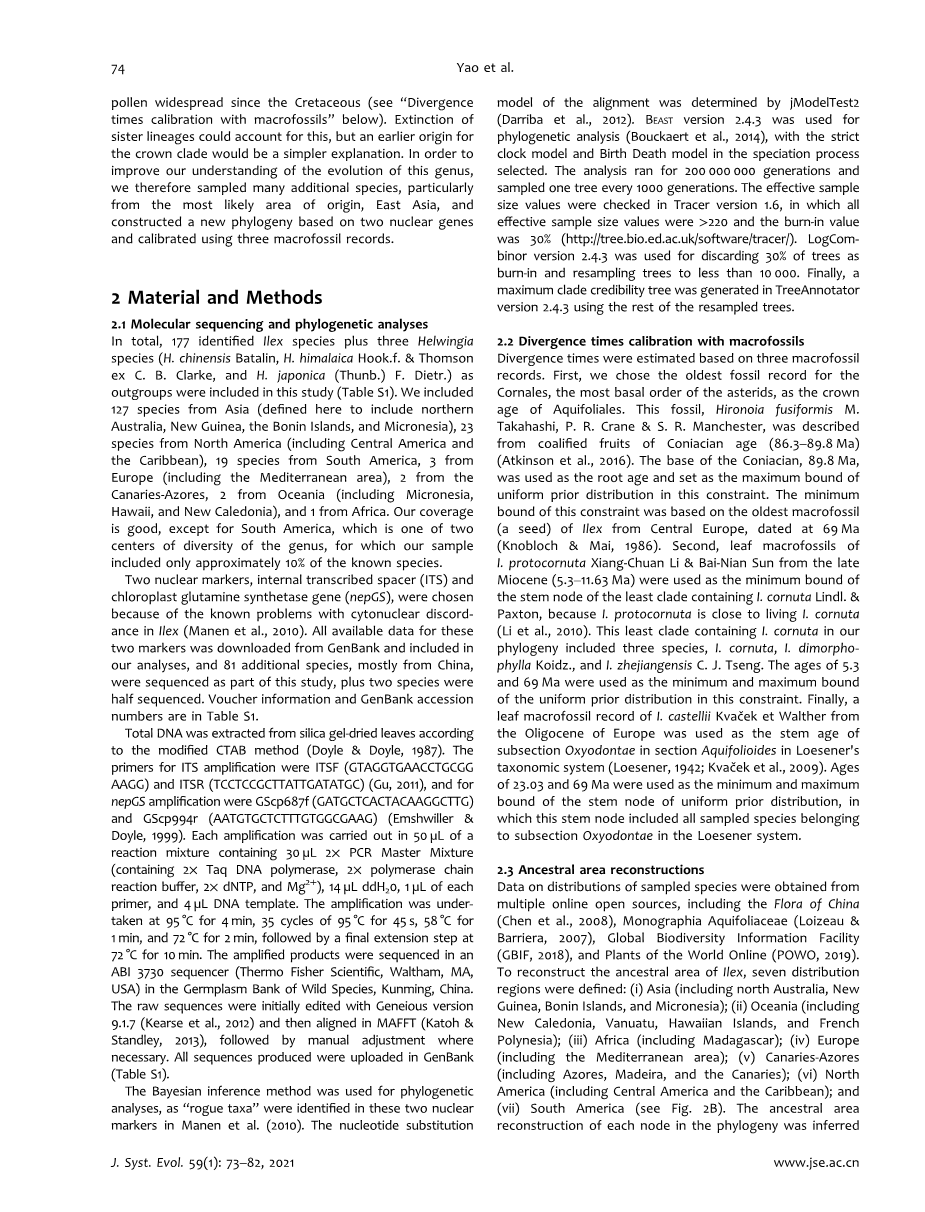 因为冬青中存在细胞核不一致性的问题(Manen等人,2010年),我们选择了两个核标记,即内转录间隔区(ITS)和叶绿体谷氨酰胺合成酶基因(NepGS)。这两个标记的所有可用数据都是从GenBank下载,并包含在我们的分析中。另外81个物种(主要来自中国)作为本研究的一部分进行了测序,还有两个物种进行了一半测序。凭证信息和GenBank登录号见表S1。