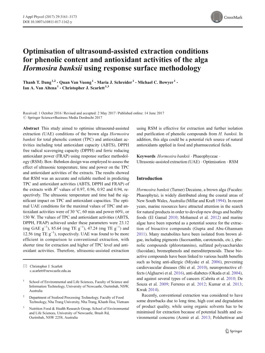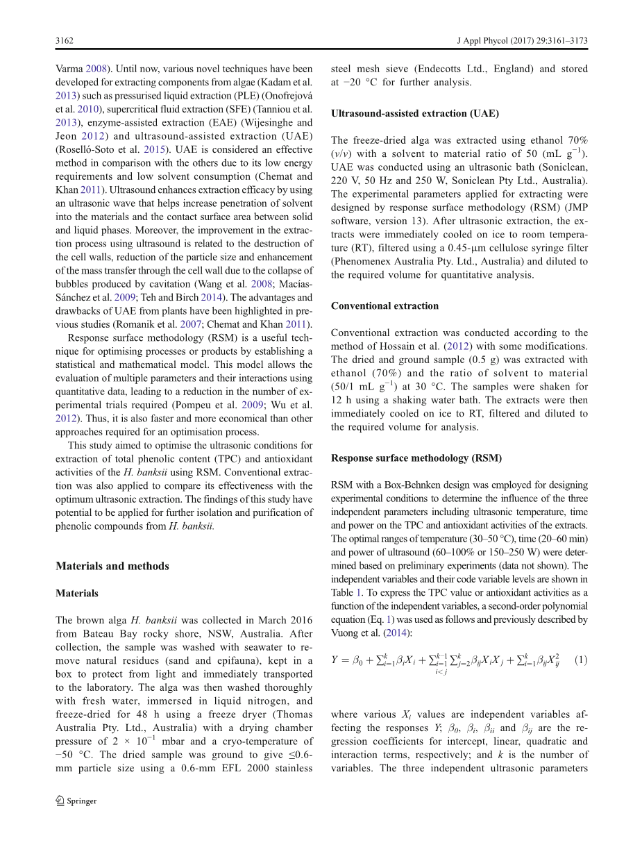 响应面法优化超声波辅助提取褐藻酚类物质和抗氧化活性的研究外文翻译资料
