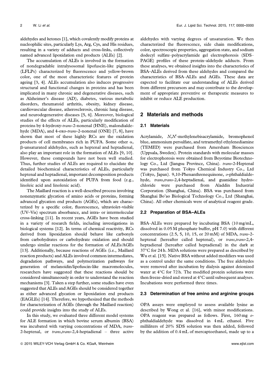 美拉德反应是一个很好描述的过程,涉及氨基酸或蛋白质的非酶糖基化,形成高级糖基化终产物(AGES),其特征是具有特定的颜色、荧光、紫外可见(UV-VIS)光谱吸收率和分子内或分子间交联。近年来,AGES具有e在许多研究领域进行了研究,包括生物系统的研究。就化学反应性而言,脂质氧化产生的RCS应表现为羰基固定gt;M碳水化合物或碳水化合物氧化,并应经历类似的反应以形成ALES/年龄。此外,由于年龄(即美拉德反应产物)和ALE的反应涉及常见的中间产物、降解途径和聚合途径,从而产生黑色素/脂褐素样大分子,研究人员建议应同时考虑这些反应,以了解MEC的反应,更进一步,一些研究甚至建议,ALE和年龄应被视为晚期糖基化或脂质氧化最终产物(EAGLES)。因此,我们假设年龄的表征方法(通过美拉德反应)可以为ALES的研究提供新的线索。