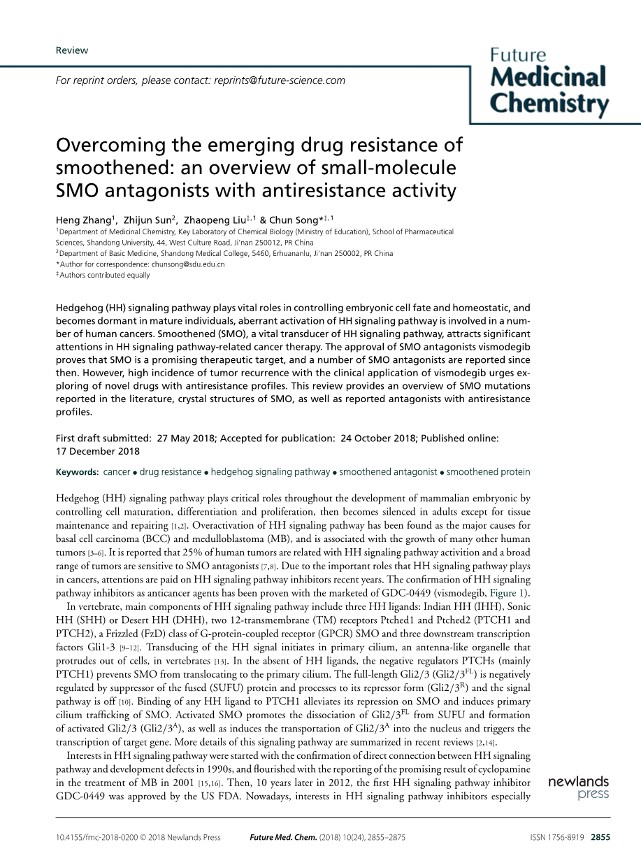 克服出现的SMO耐药性:具有抵抗耐药性的小分子 SMO 拮抗剂的综述