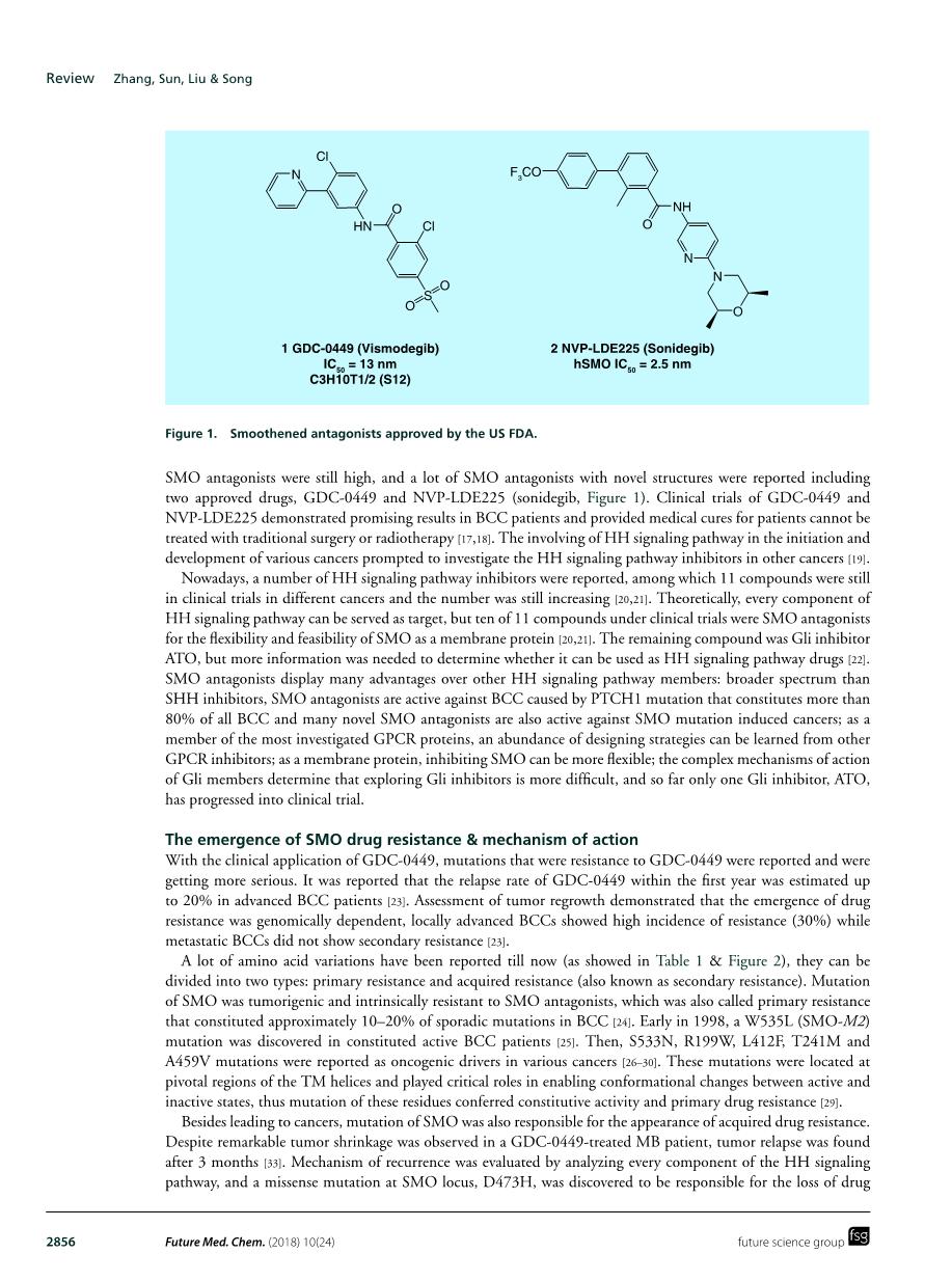 对HH信号通路的兴趣始于1990年代HH信号通路与发育缺陷之间直接联系的确认,并随着2001年环巴胺在MB治疗中的有希望的结果的报道而蓬勃发展[15,16]。然后,十年后的2012年,第一个HH信号通路抑制剂GDC-0449被美国FDA批准上市。如今,人们对HH信号通路抑制剂尤其是SMO拮抗剂的关注仍然很高,据报道,许多具有新结构的SMO拮抗剂包括两种已被批准的药物GDC-0449和NVP-LDE225(sonidegib,图1)。GDC-0449和NVP-LDE225的临床试验表明,在BCC患者中有可喜的结果,并为无法用传统手术或放射疗法治疗的患者提供了药物治疗[17,18]。HH信号通路参与各种癌症的发生和发展促使人们研究其它癌症中的HH信号通路抑制剂[19]。