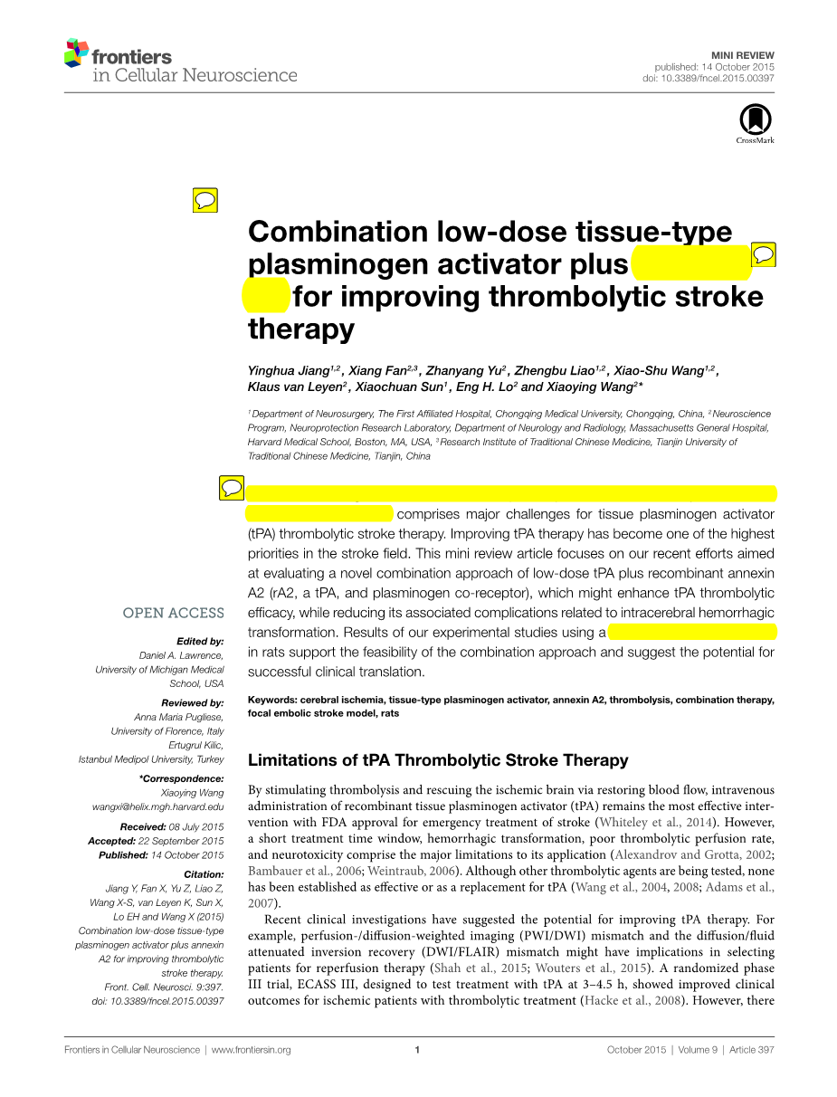 单位 1 Department of Neurosurgery, The First Affiliated Hospital, Chongqing Medical University, Chongqing, China, 2 Neuroscience Program, Neuroprotection Research Laboratory, Department of Neurology and Radiology, Massachusetts General Hospital, Harvard Medical School, Boston, MA, USA, 3 Research Institute of Traditional Chinese Medicine, Tianjin University of Traditional Chinese Medicine, Tianjin, China