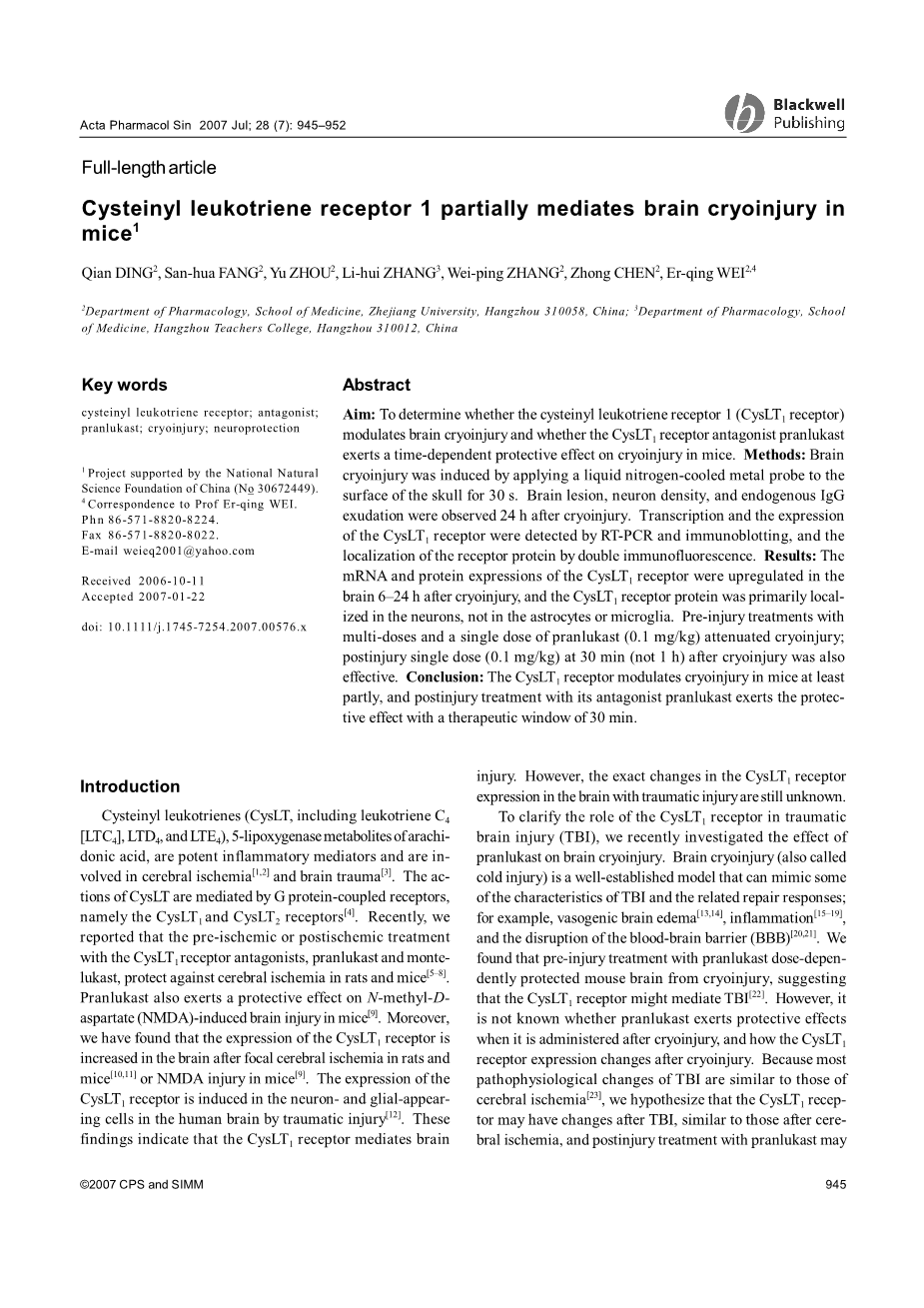 半胱氨酰白三烯受体-1部分介导小鼠脑冷冻伤