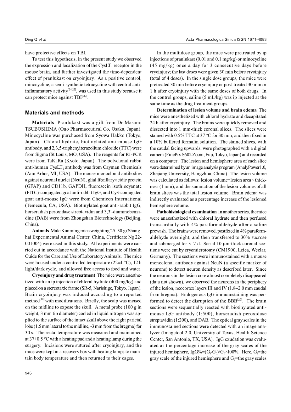 冷冻伤后6,12和24小时,CysLT1受体蛋白在损伤皮质中的表达也显着增加(图4C)。 minocycline(45mg / kg),显著抑制增加的表达,而非pranlukast(0.01和0.1mg / kg)(P lt;0.05,图5)。 双重免疫荧光显示CysLT1受体免疫反应增强,但它们表达的CysLT1受图1. minocycline 和pranlukast对病灶体积和脑水肿的时间依赖性的效应,24h后的损伤。(A)在小鼠多剂量预处理后,TTC染色脑切片显示皮质病变(箭头)。(B )和(C)病灶体积在损伤