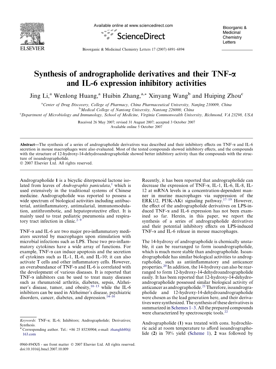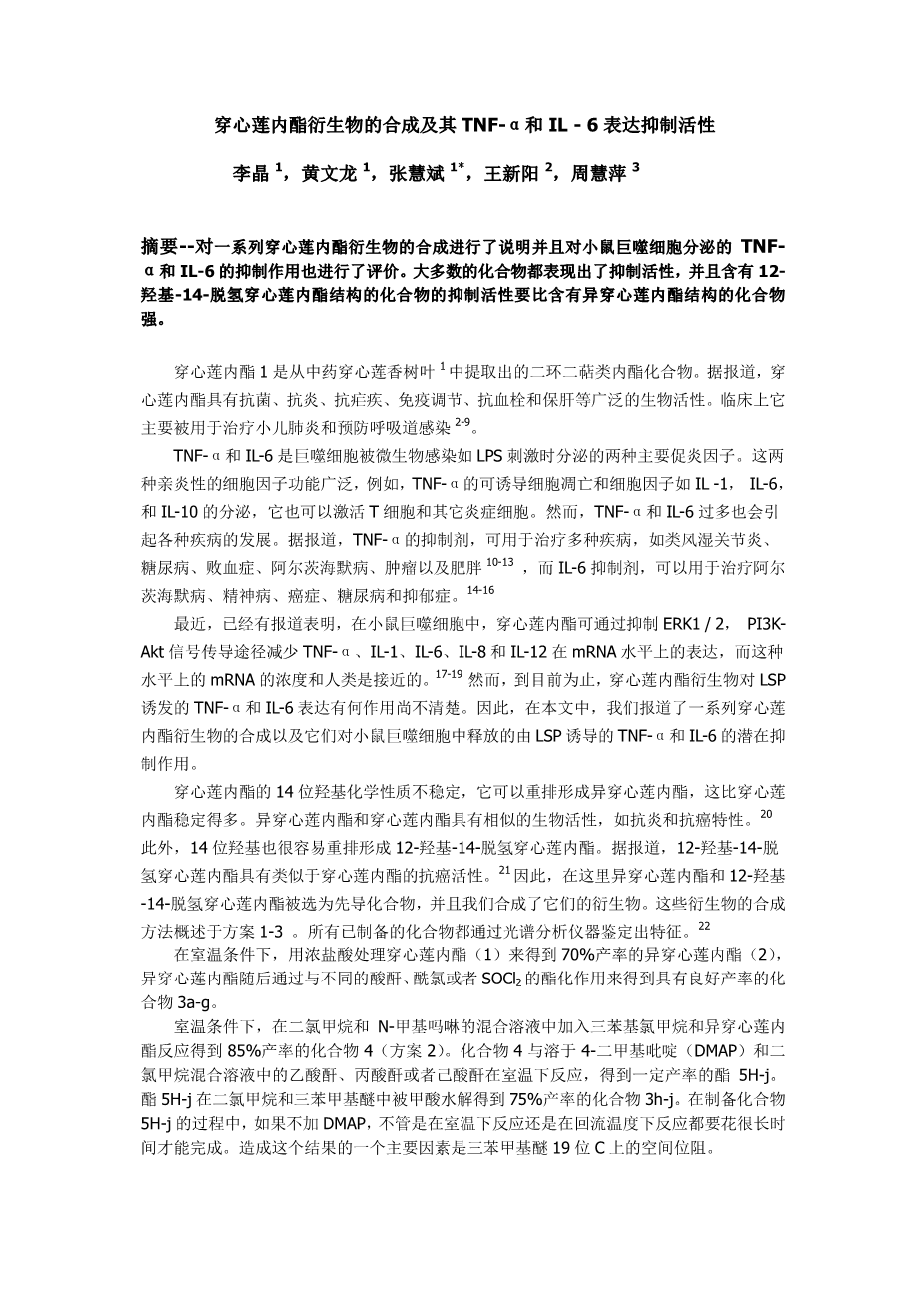 - 穿心莲内酯衍生物的合成及其TNF-a和IL – 6表达抑制活性外文翻译资料