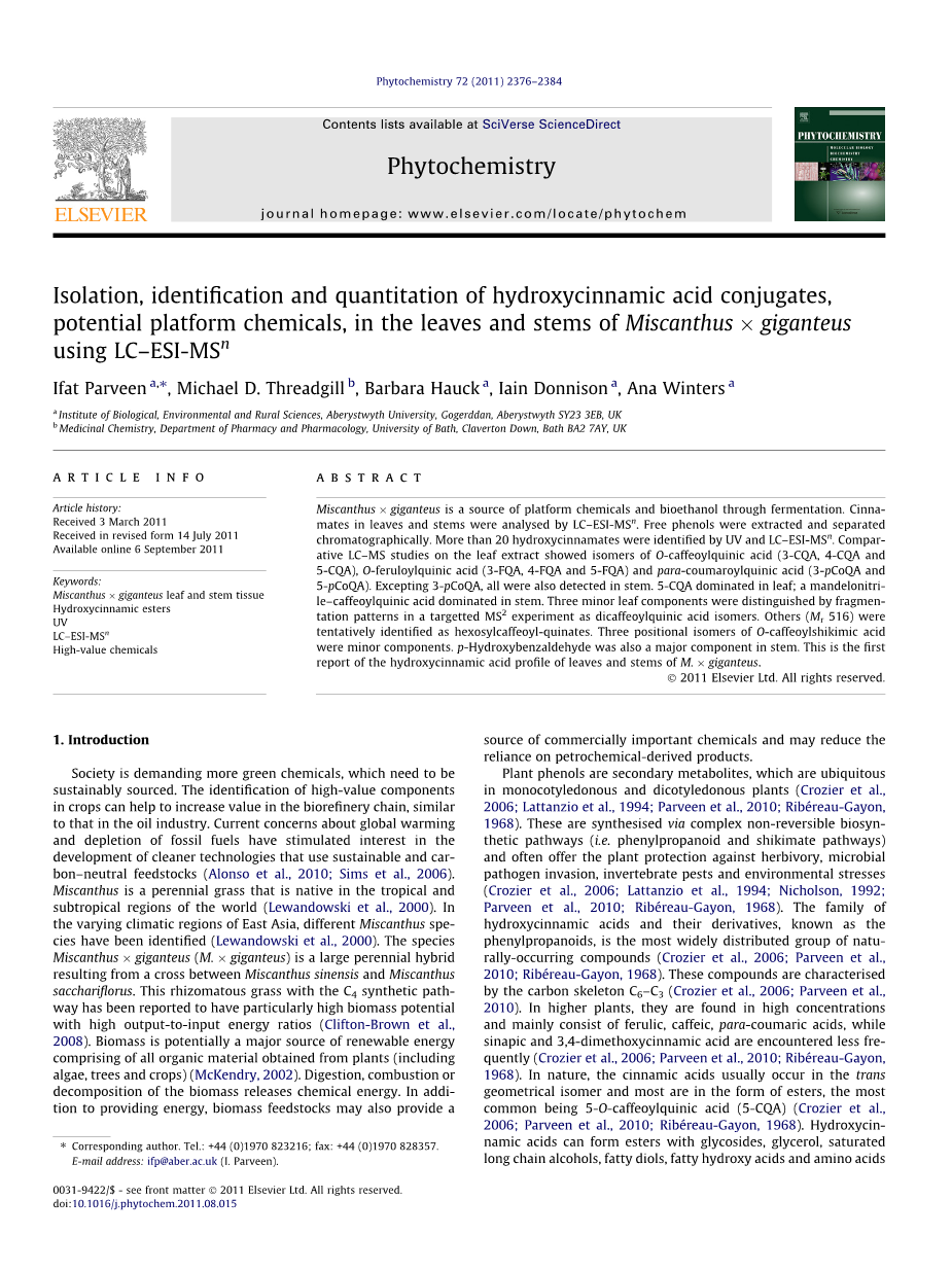 关键字:芒草的茎、叶组织 羟基肉桂酸 UV LC-ESI-MSn 高价值化学品