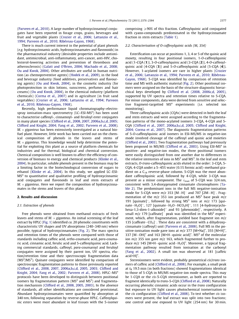 最近,高效液相色谱-电喷雾离子化-质谱(LC-ESI-MSn)已被用于表征许多植物物种中的咖啡酰基,肉桂酰基和阿魏酸酯共轭物(Clifford et al., 2008, 2007, 2006a,b,c,d, 2005;Clifford and Knight, 2004; Fang et al., 2002; Parveen et al., 2008)。芒属植物已被广泛研究,作为一种天然的生物燃料植物。然而,在化学上对芒属植物叶和茎中酚类化合物的组成却工作很少。这方面的知识将有助于确定其潜力,并利用其作为平台化学品的工业与热,生物与化学转化的来源。众所周知,化学成分影响生物质转化为能量和化学产品的效率。(Klinke et al.,2004)。特别地,存在于生物质中的可溶性酚可能是糖在乙醇生物技术转化中的限制因素(Klinke et al., 2004)。在本研究中,我们应用LC-ESI-MSn定量和定性地分析了芒草的叶和茎提取物中羟基肉桂酸共轭物和类黄酮。这里我们报告植物的茎和叶中羟基肉桂酸酯的组成。